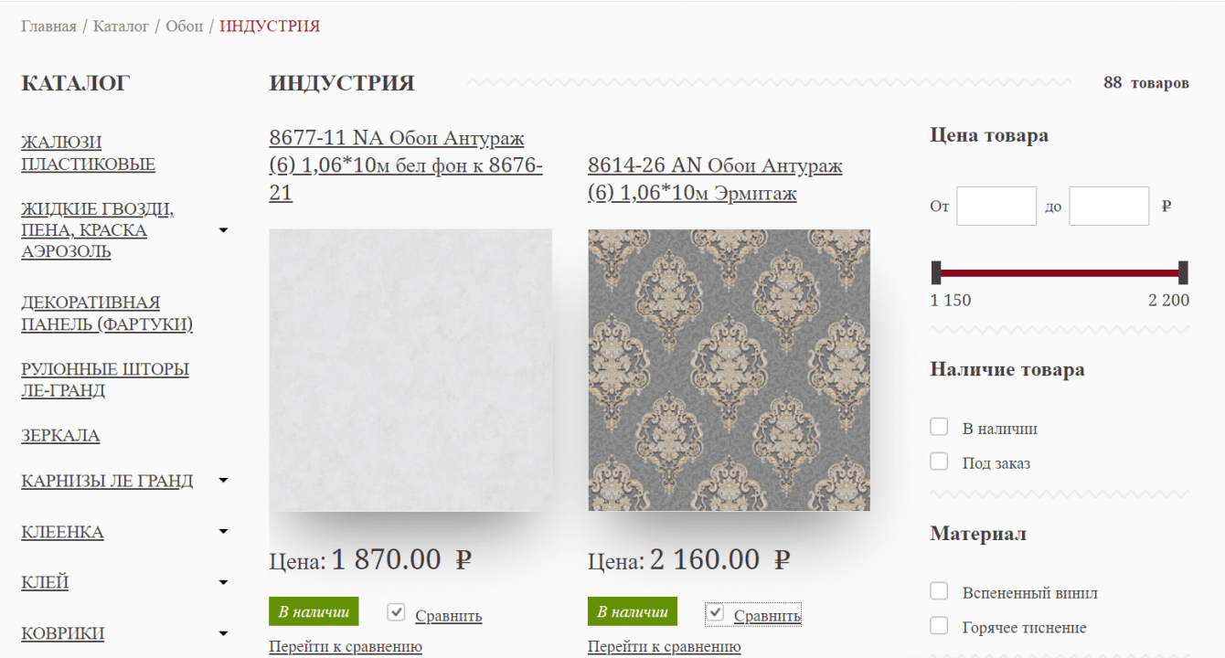 На главной странице расположен каталог с удобным поиском. Так как это интернет магазин товаров для ремонта, пользователю важно точно видеть текстуру, оттенки, рисунок отделочных материалов. Для этого мы реализовали возможность просмотра картинки в увеличенном состоянии с сохранением ее качества, товар можно развернуть на весь экран.