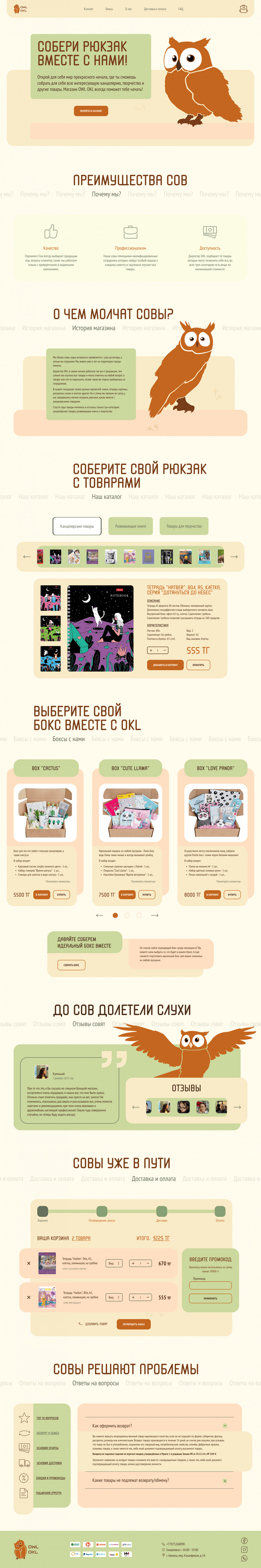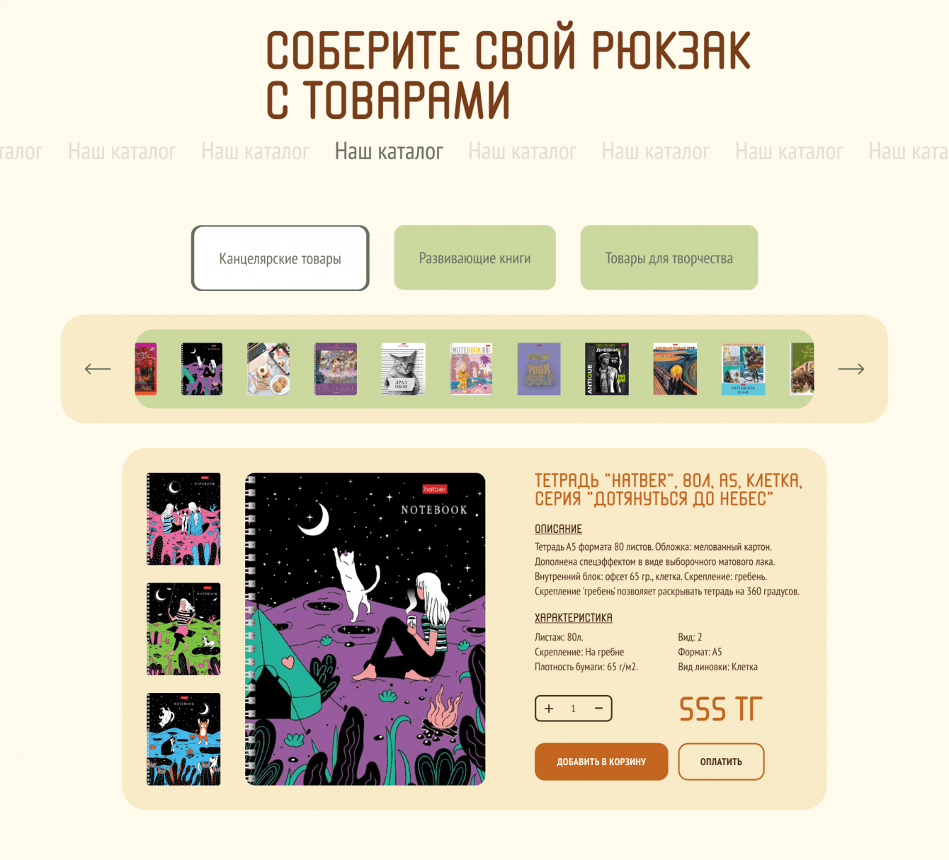 Создать Landing Page для магазина в котором совмещены три категории товарвов: Канцелярсике товары, развивающие книги, товары для творчества. Все три вида товаров должны хорошо раскрыться, дизайн должен быть спокойным, но интересным