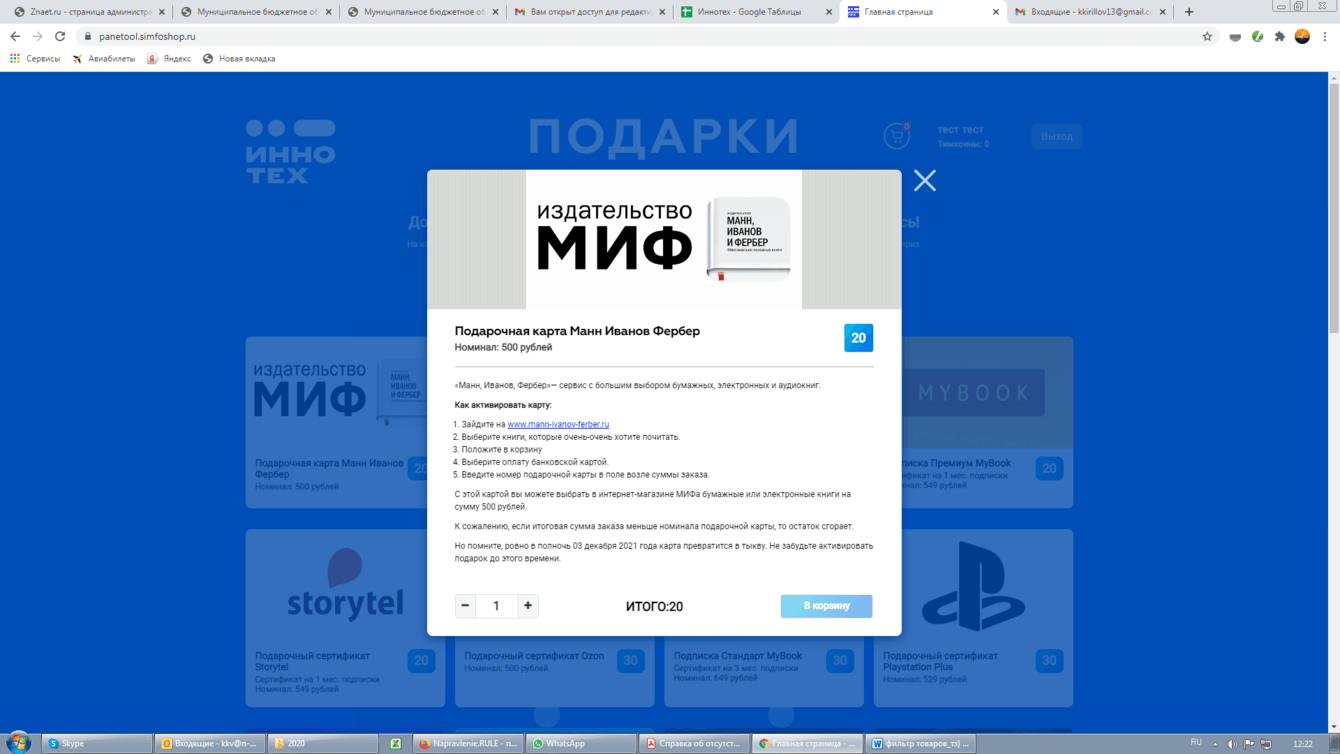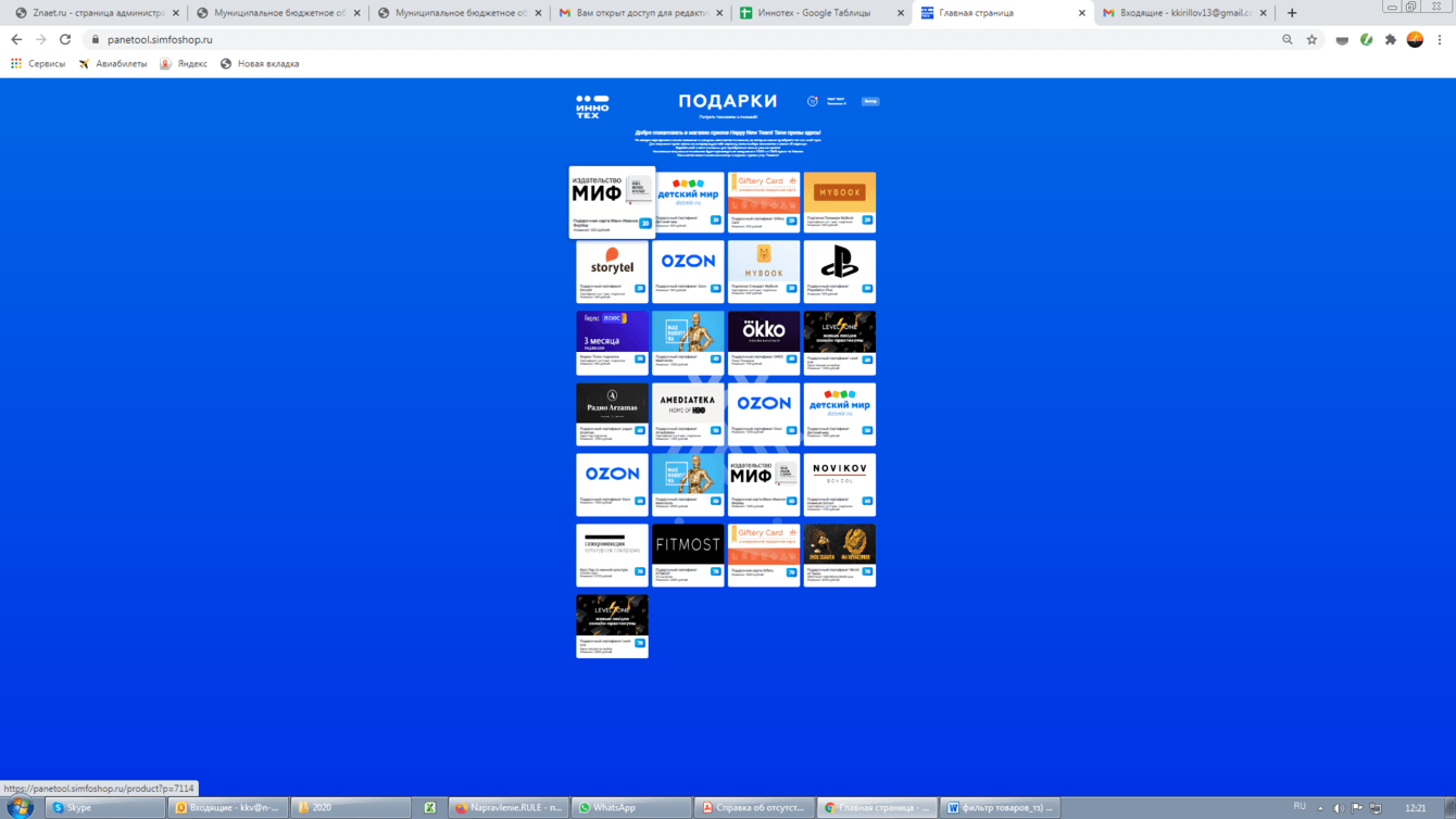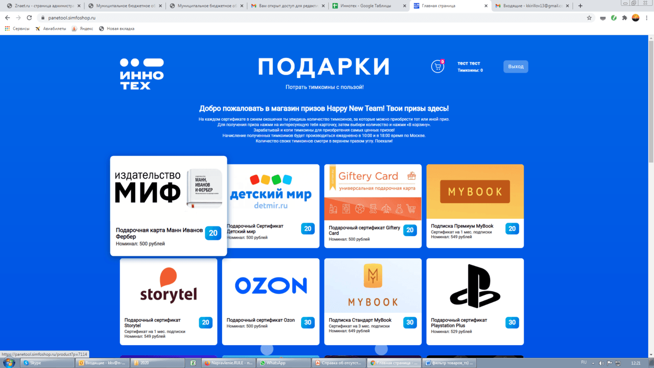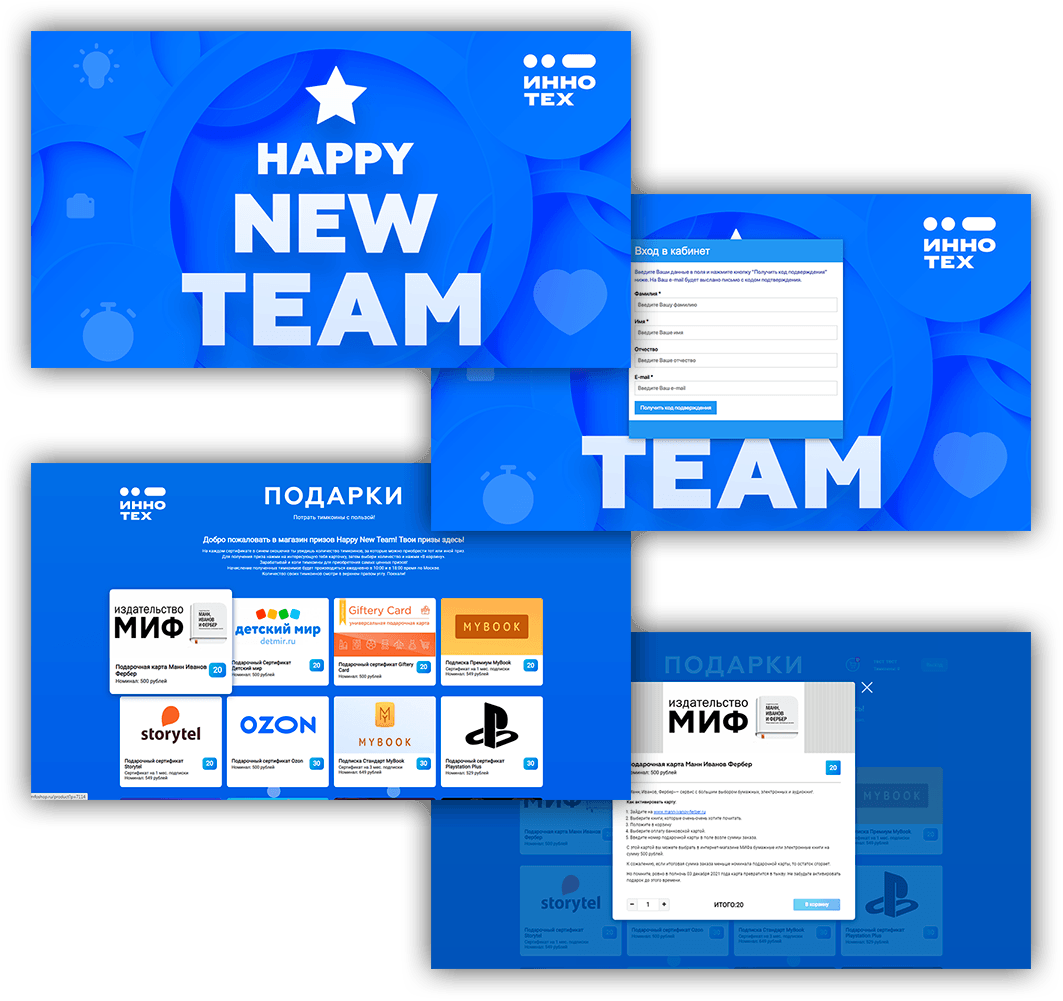 Реализация он-лайн магазина приобретения новогодних подарков. Реализация он-лайн покупки покупателя с помощью набранных баллов. Балы у покупателя формируются за счет участия и побед в корпоративных розыгрышах, проводимых заказчиком. Реализация интеграции (начисление) балов производится в автоматическом режиме.
