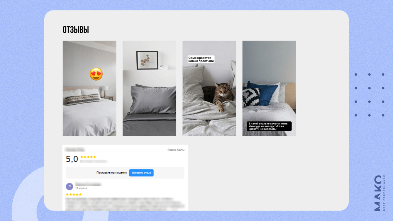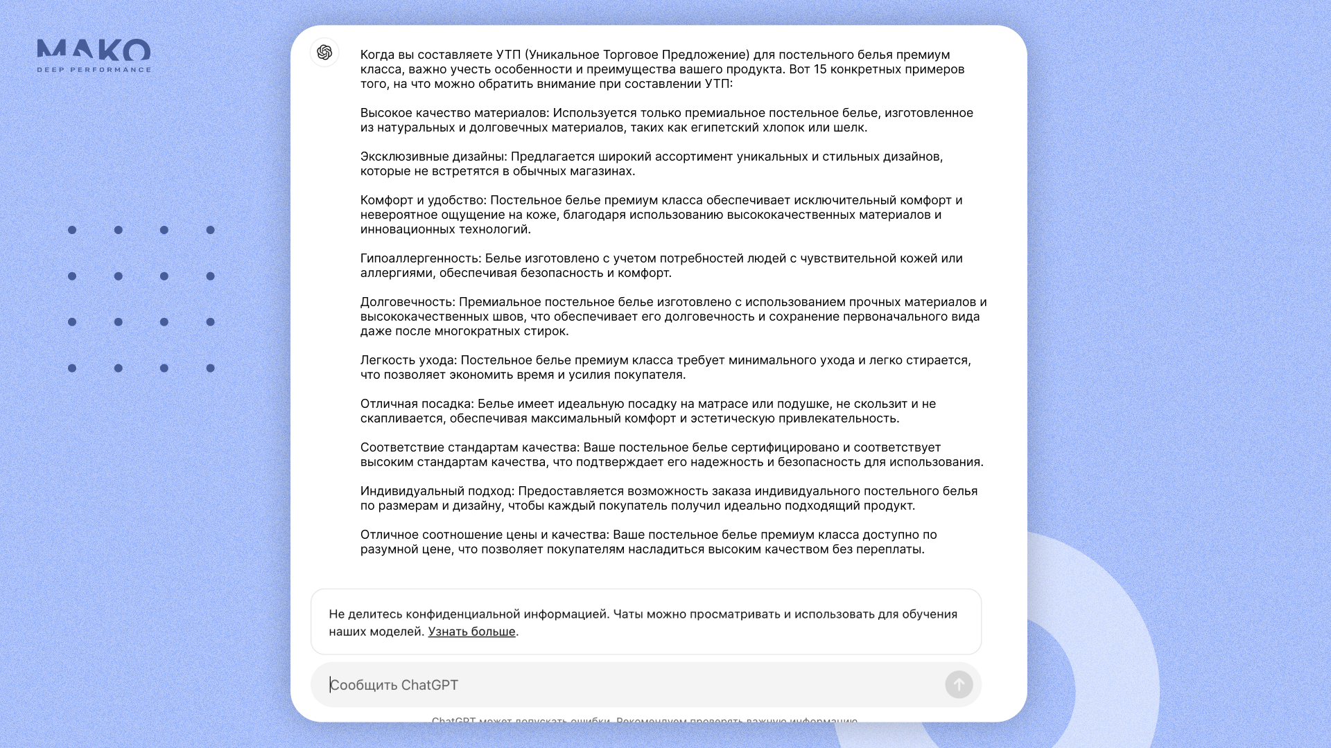 Параллельно рекламе мы исследовали ЦА. Расспросили отдел продаж клиента. Провели коридорное исследование — опрашивали знакомых и соседей, которые вписываются в премиум-сегмент. Изучали отзывы на Яндекс Картах и маркетплейсах, в отзовиках. Закинули задачку ChatGPT, чтобы он рассказал про свое цифровое видение.
