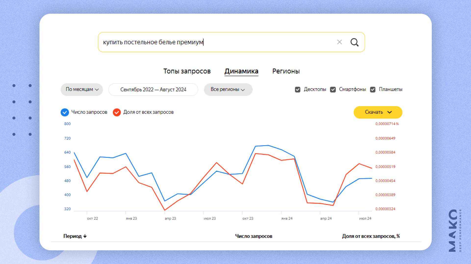 Но инструменты Я.Директ приспособлены для массовых продаж. В них сложно вычленить премиум-сегмент, соблюдая баланс между объемом и качеством ЦА. Да, есть настройка по платежеспособности, но по факту она не работает. А на Поиске богатые люди набирают те же широкие ключевые запросы, что и все остальные.