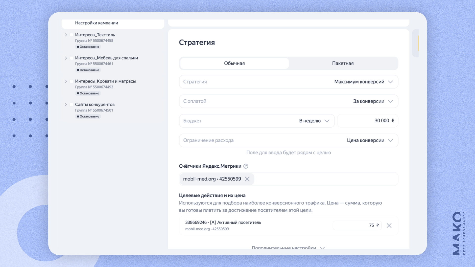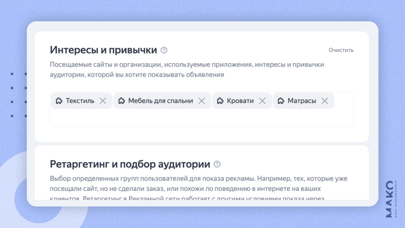 В настройках поработали с ключевыми фразами и интересами. Посмотрели в Метрике, какие из них дают лучшую конверсию. Выбрали такие: текстиль, мебель, матрасы, кровати. Еще добавили таргетинг по пользователям, которые посещают сайты конкурентов.