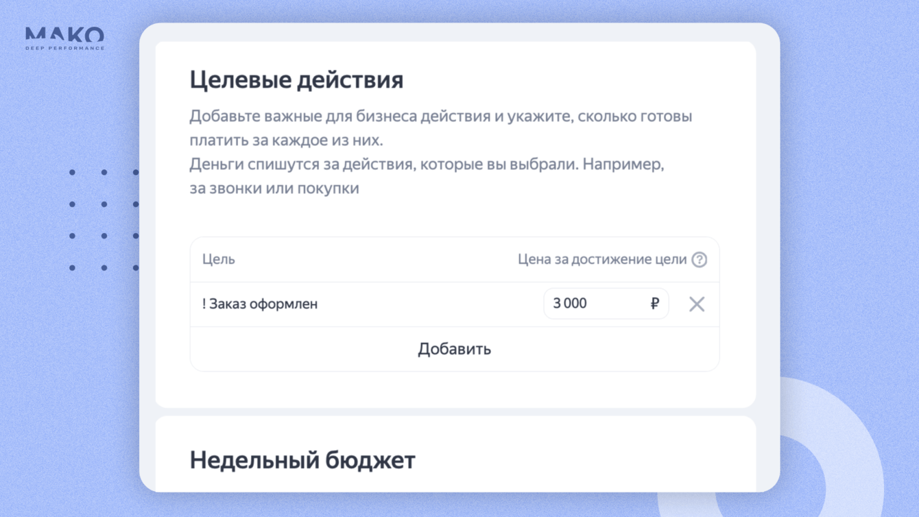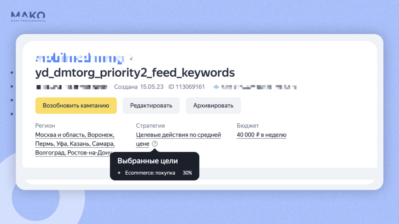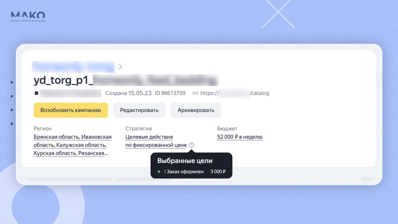 В рекламу по проблемным городам, отправили сокращенный фид, в котором оставили только самые «недорогие» товары, например комплекты не дороже 11 000 р. И создали цель — оплата за оформленный заказ.
