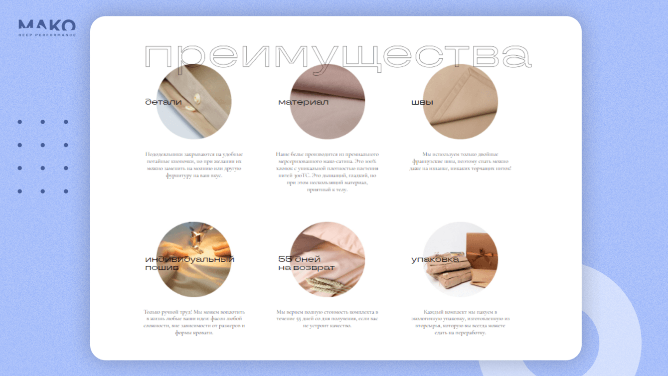 Это пример, как один из брендов российского элитного белья неплохо рассказывает о своих преимуществах. А чем мы будем отличаться?