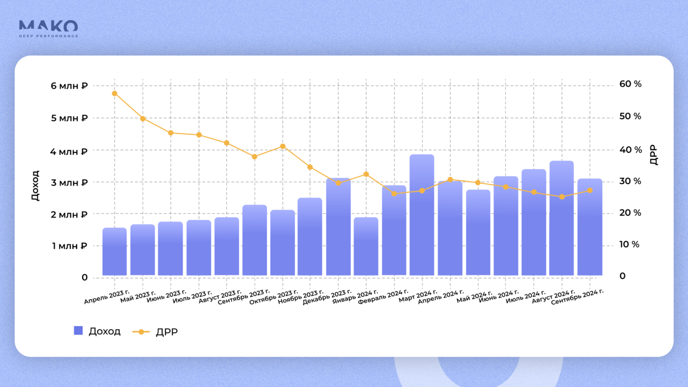 Владелец хотел роста дохода в 2 раза, а также снижения ДРР до 30%. В марте он начал искать подрядчика, который улучшит показатели и обратился к нам в МАКО.