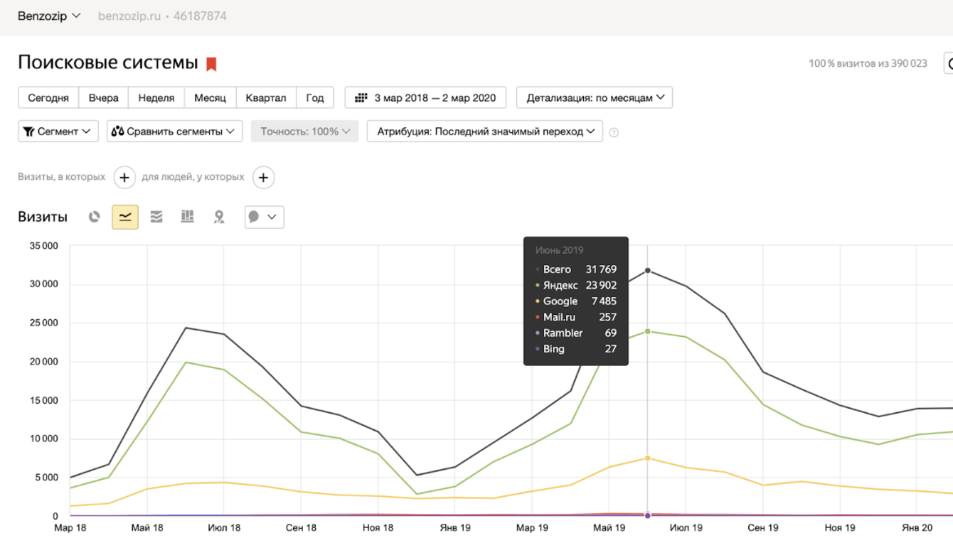 Спустя несколько месяцев, клиент принял решение переехать со своей CMS на более удобную для него, нами были проведены работы по переносу сайта, повторной настройке оптимизации и т.д. У клиента не было возможности перенести URL в соответствии со старыми, и мы приняли решение перестроить структуру сайта, мы заранее предупредили клиента о том, что посещаемость может упасть на время переноса, переработки структуры и других работ, он согласился на риск. Мы не только поменяли URL-адреса страниц сайта, но и воспользовавшись хорошим моментом внедрили гибридную структуру, которую вывели на основе анализа конкурентов. Это привело к тому, что посещаемость сайта выросла до 31000 в месяц в пиковый сезон: