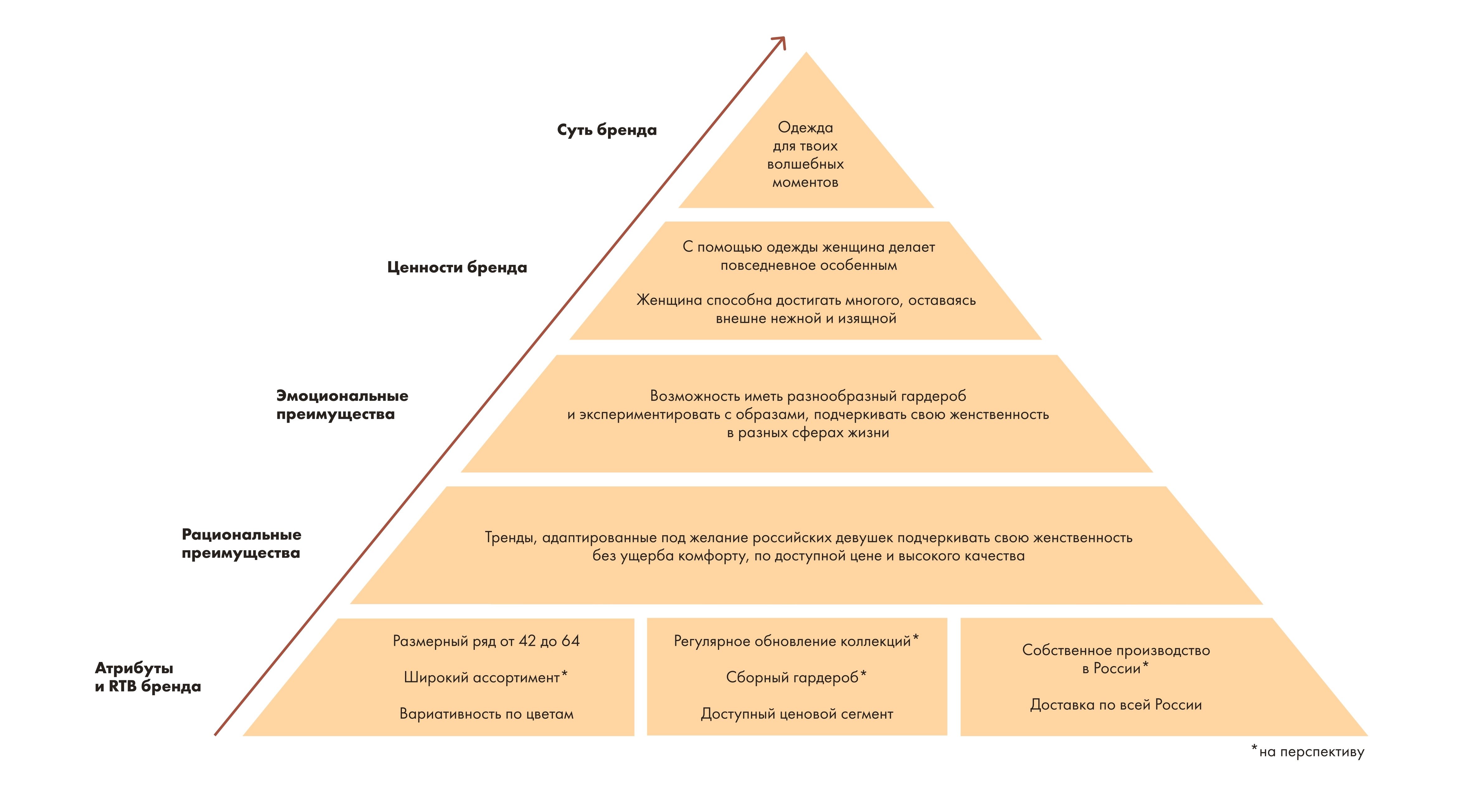Так как компания на тот момент находилась в переходном периоде, было важно отразить смыслы, которые не отпугнут уже существующую аудиторию и будут актуальны для новых покупателей, а также соответствовать ассортименту, с которым работает бренд. Продуктовая линейка бренда ограничивала целевую аудиторию по возрасту и типу потребления. Ключевой идеей бренда стала красота без ущерба качеству и комфорту. Для подтверждения этому одним из эмоциональных УТП мы использовали тот факт, что соосновательницы бренда сами участвуют в разработке моделей и с удовольствием их носят в повседневной жизни.