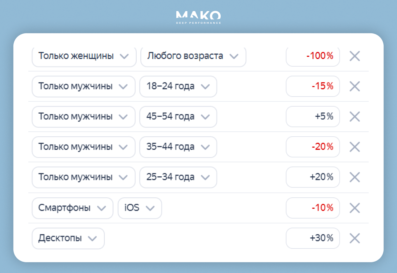 Мы продолжали искать приемы для продажи более дорогих товаров и комплекса услуг. Эксперимент с сегментацией аудитории по полу и возрасту оказался неудачным. Выяснили, что больше заявок приходит от мужчин, чем от женщин. Раздробили рекламу на сегменты по полу и возрасту. На тех, кто покупает чаще, установили повышающие корректировки.
