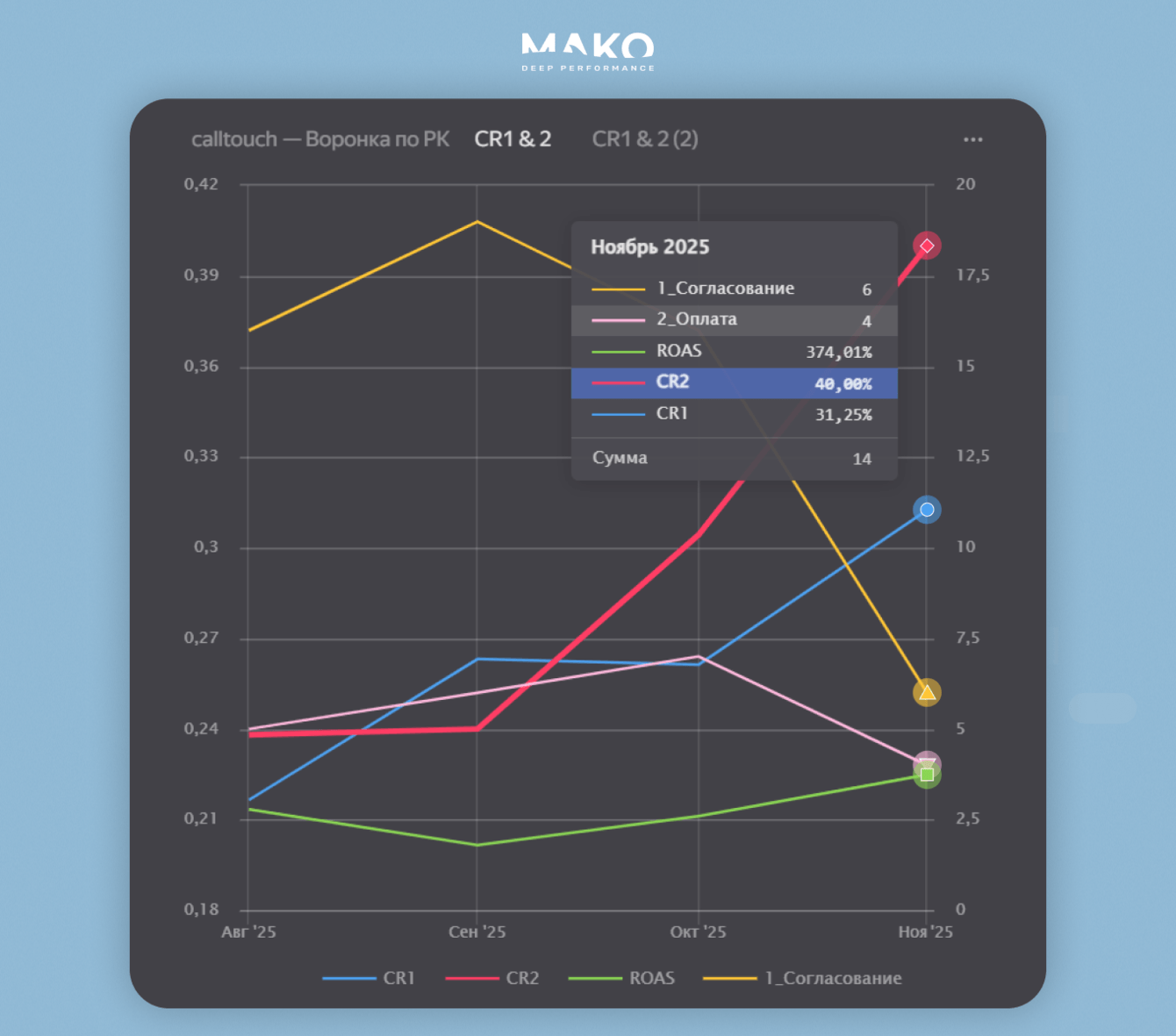 Синяя линия CR1 ― это конверсия в выставление счета, красная CR2 ― в оплату