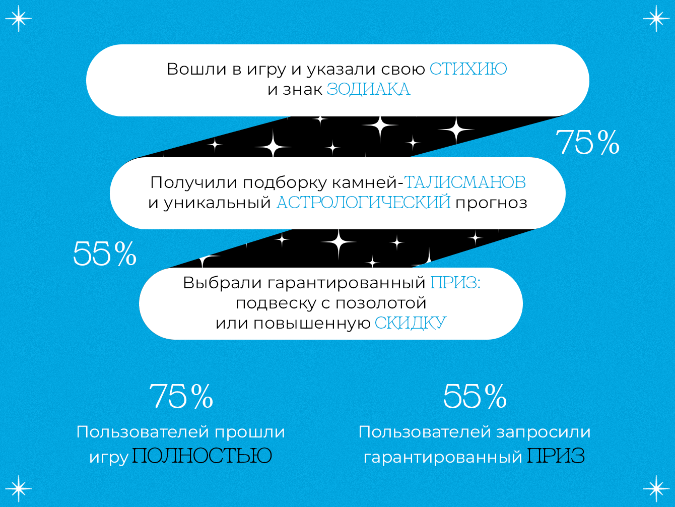 Такой подход не только удерживал внимание пользователя, но и мягко направлял его к финальной цели — совершению покупки. 75% пользователей дошли до конца игры, и более половины из них запросили промокод на гарантированный приз.