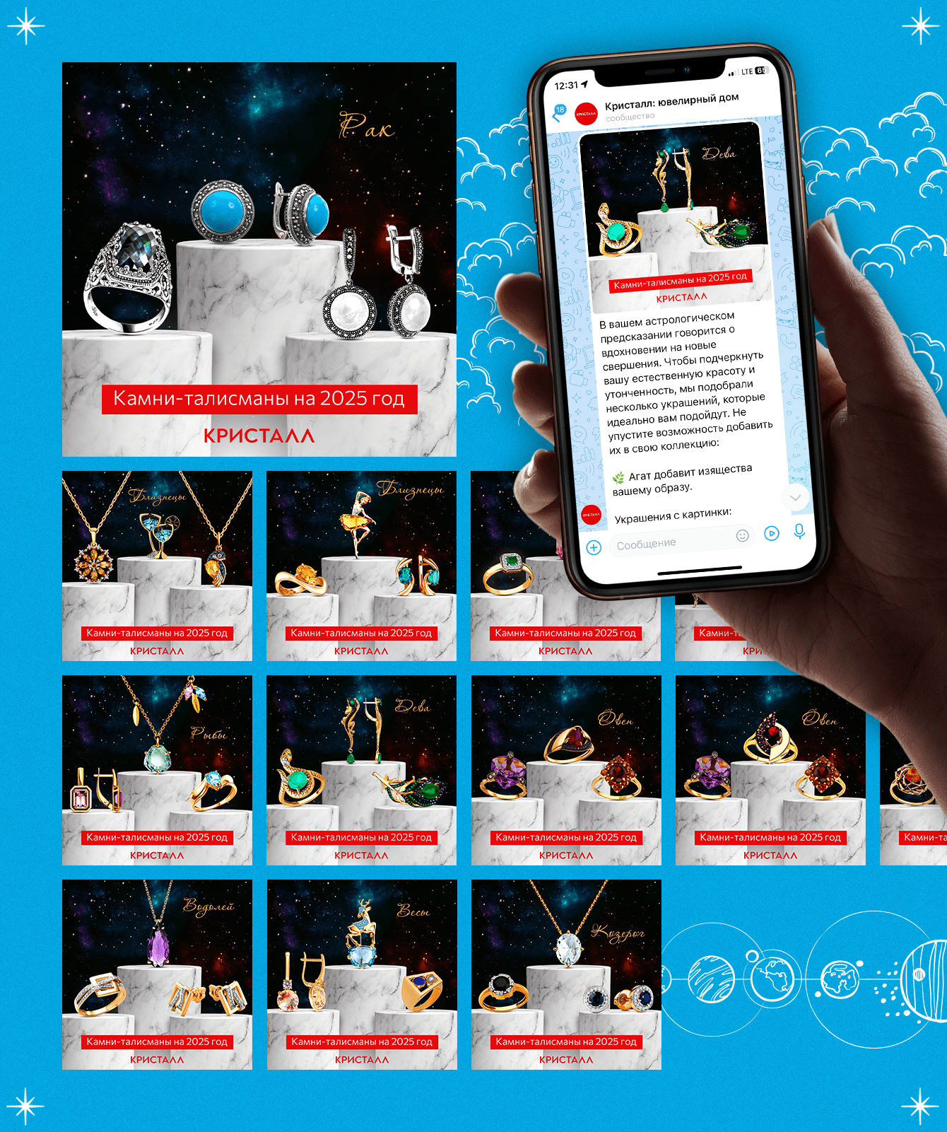 Кейс «Ювелирный гороскоп» для «Кристалла» — это пример того, как тренды и понимание аудитории творят чудеса. Астрология, уже несколько лет на пике, стала основой для эмоциональной связи. Команда, несмотря на сжатые сроки, создала чат-бота с прогнозами, рекомендациями и призами, который мягко вел к покупкам.
