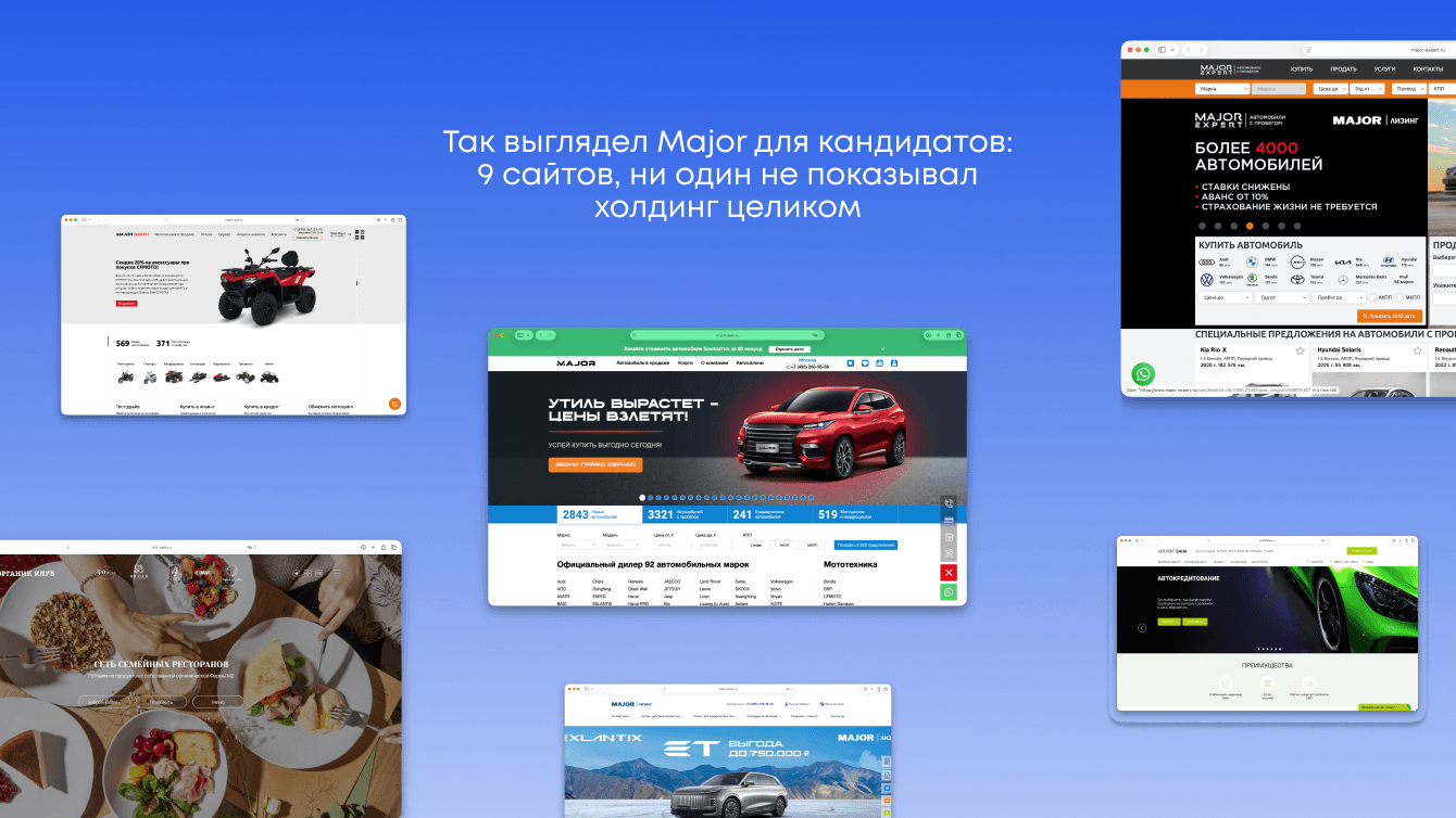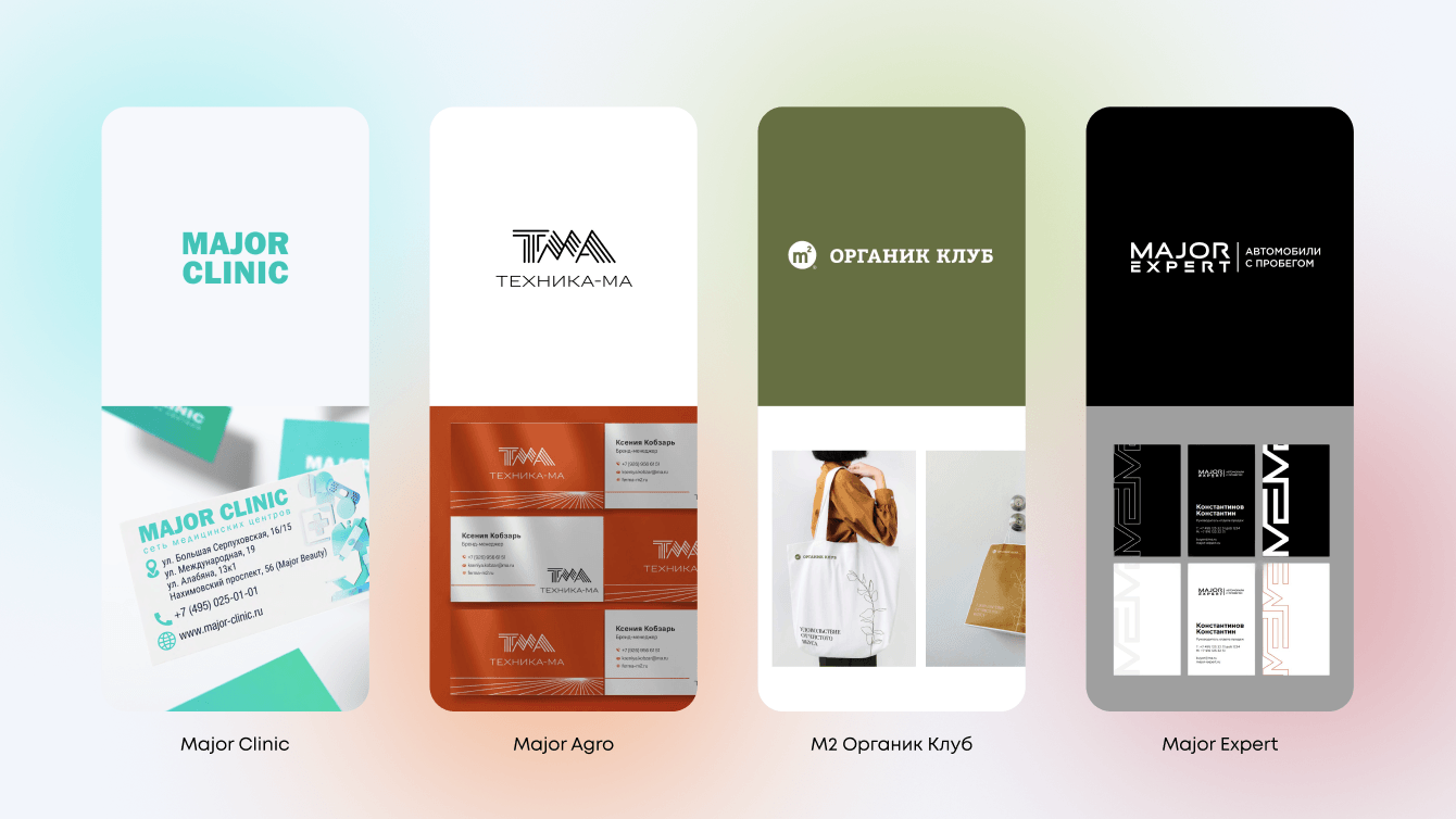 У холдинга Major — 9 направлений, причем у каждого свой стиль и брендбук. Где-то строгий автостиль, где-то мягкие кофейно-оливковые палитры и декоративные элементы.