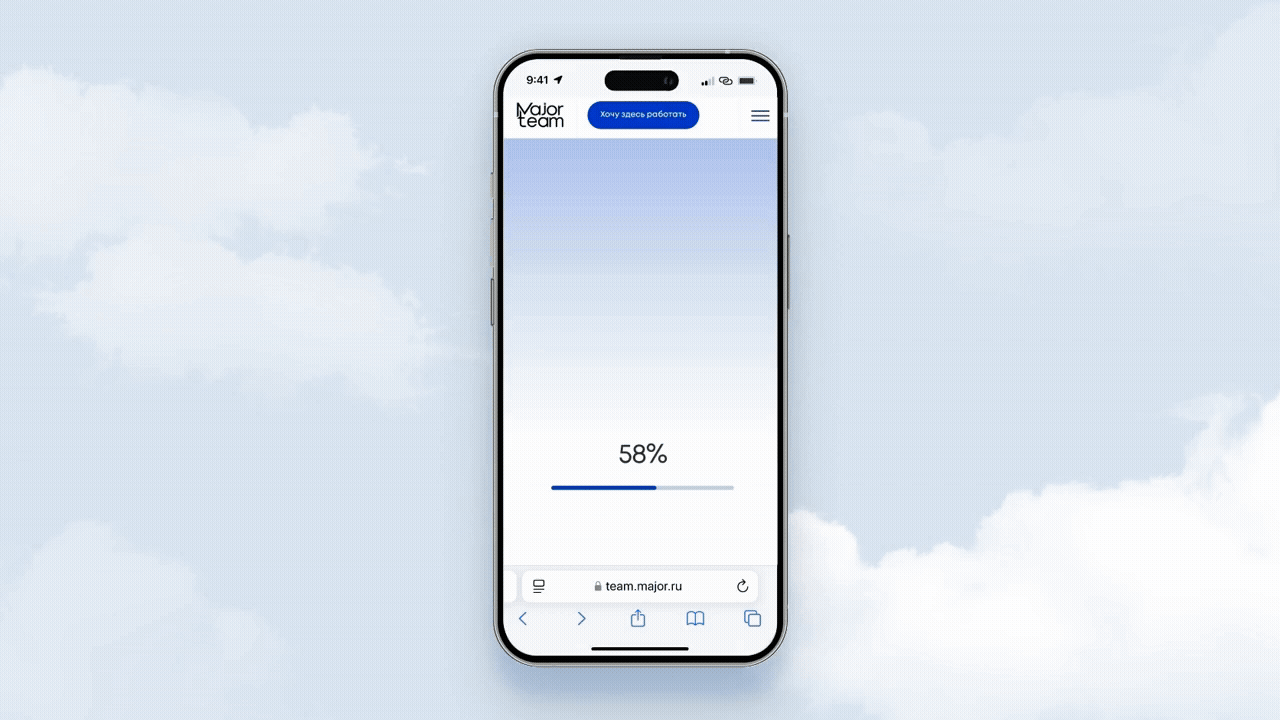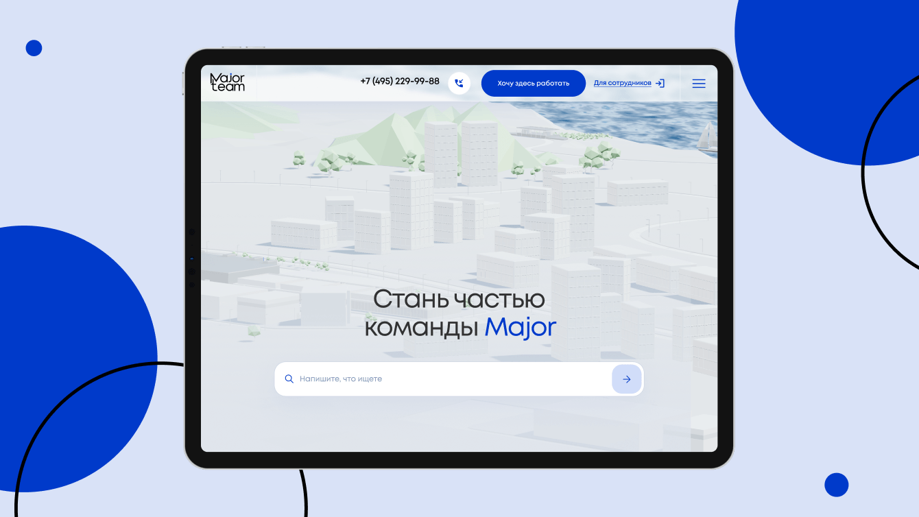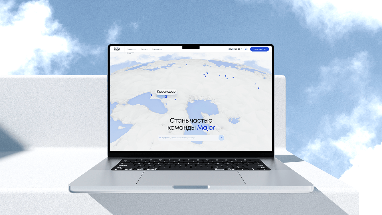 Задача главной страницы — за секунды показать масштаб Major и вовлечь кандидата. Вместо стандартного хедера с героями и текстом мы сделали интерактивную 3D-сцену.