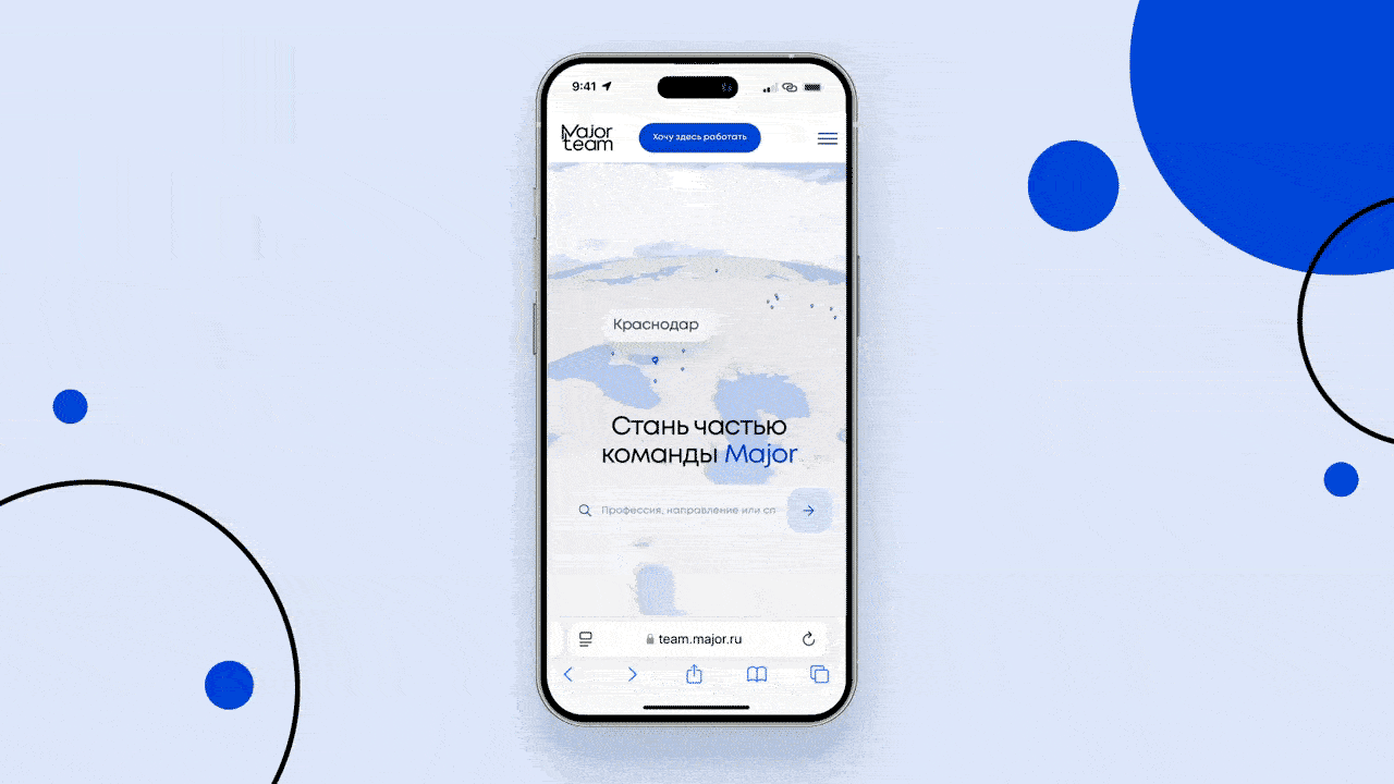 ✔️ Задача со звездочкой — сделать сайт не как у всех. Major хотели выделиться, отстроиться от типовых карьерных сайтов, поэтому были готовы к смелой концепции.