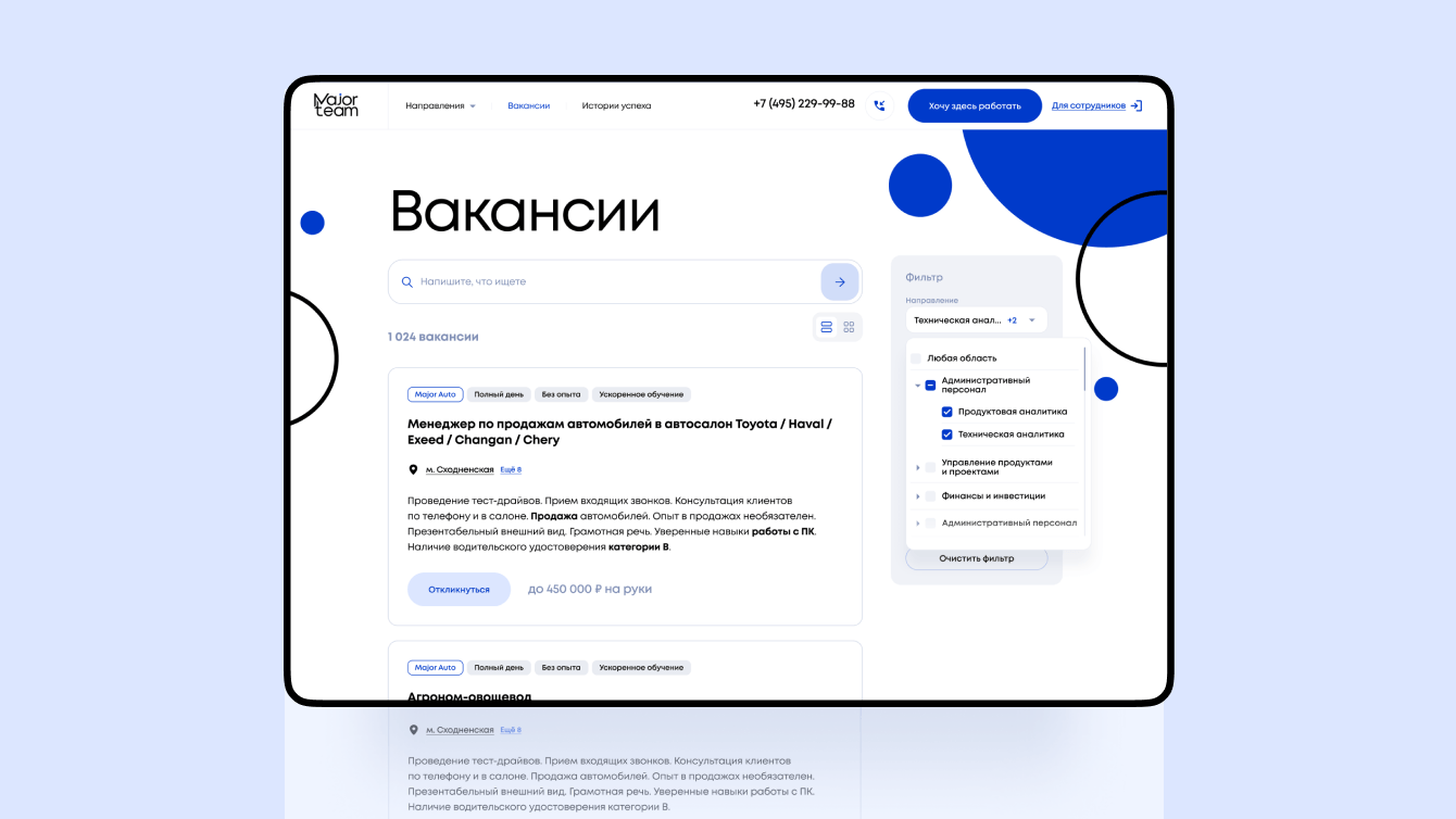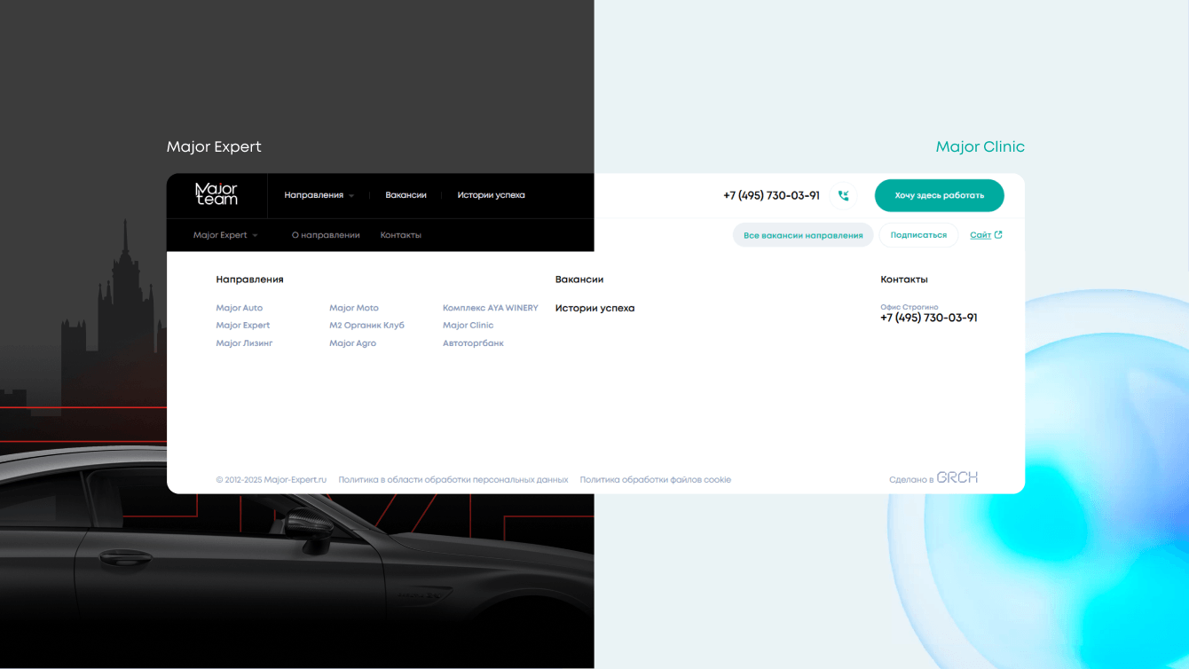 HR-отдел публикует вакансии на hh.ru, Авито и сайтах направлений, которые заточены скорее на клиентов, чем на кандидатов. Например, у Major Auto — свой сайт, у ресторанов — свой, у клиники — тоже свой. И на каждом из них есть отдельная форма, где можно посмотреть все вакансии и отправить резюме. Информации о других направлениях на этих страницах нет.