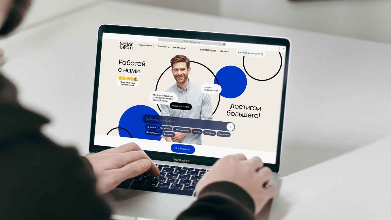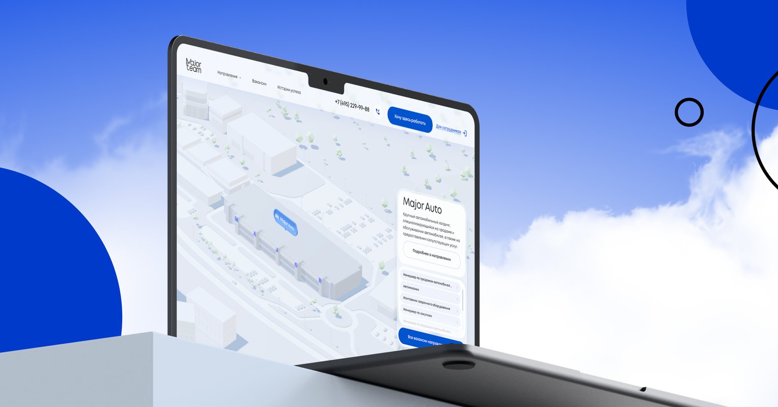 Сайт разрабатывали 6 месяцев — это быстро, с учетом 3D-сцен, девяти направлений, десятков макетов и полной адаптации под мобилку. Обычно подобный проект занимает от 9 до 12 месяцев. Карьерный портал Major Team современный, удобный и отличается от типовых решений.