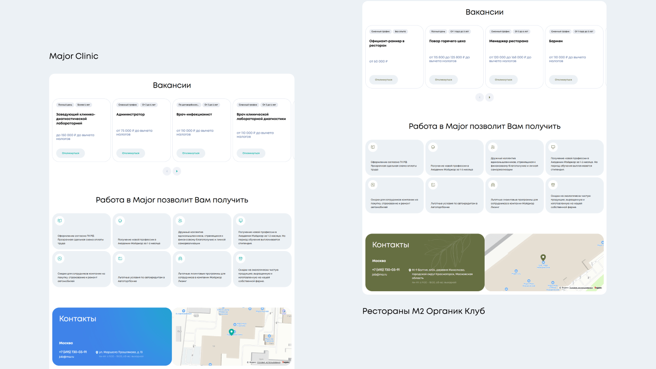 ✅ набор повторяющихся блоков, которые есть у всех направлений — вакансии, преимущества работы, контакты.