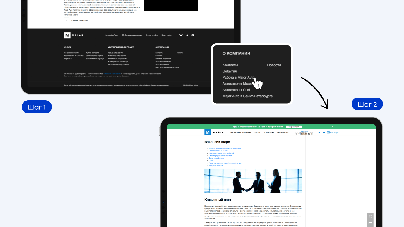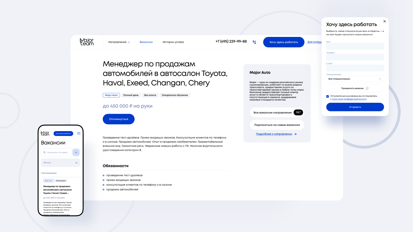 Если человек ищет работу на страницах брендов, ему приходится переходить по разным сайтам и вручную заполнять одни и те же формы. Например, Major Auto и Major Expert — это два направления, которые продают автомобили: новые и с пробегом. Менеджер по продажам может закрывать сделки в обоих сегментах, но ему нужно откликаться дважды, на двух разных сайтах.