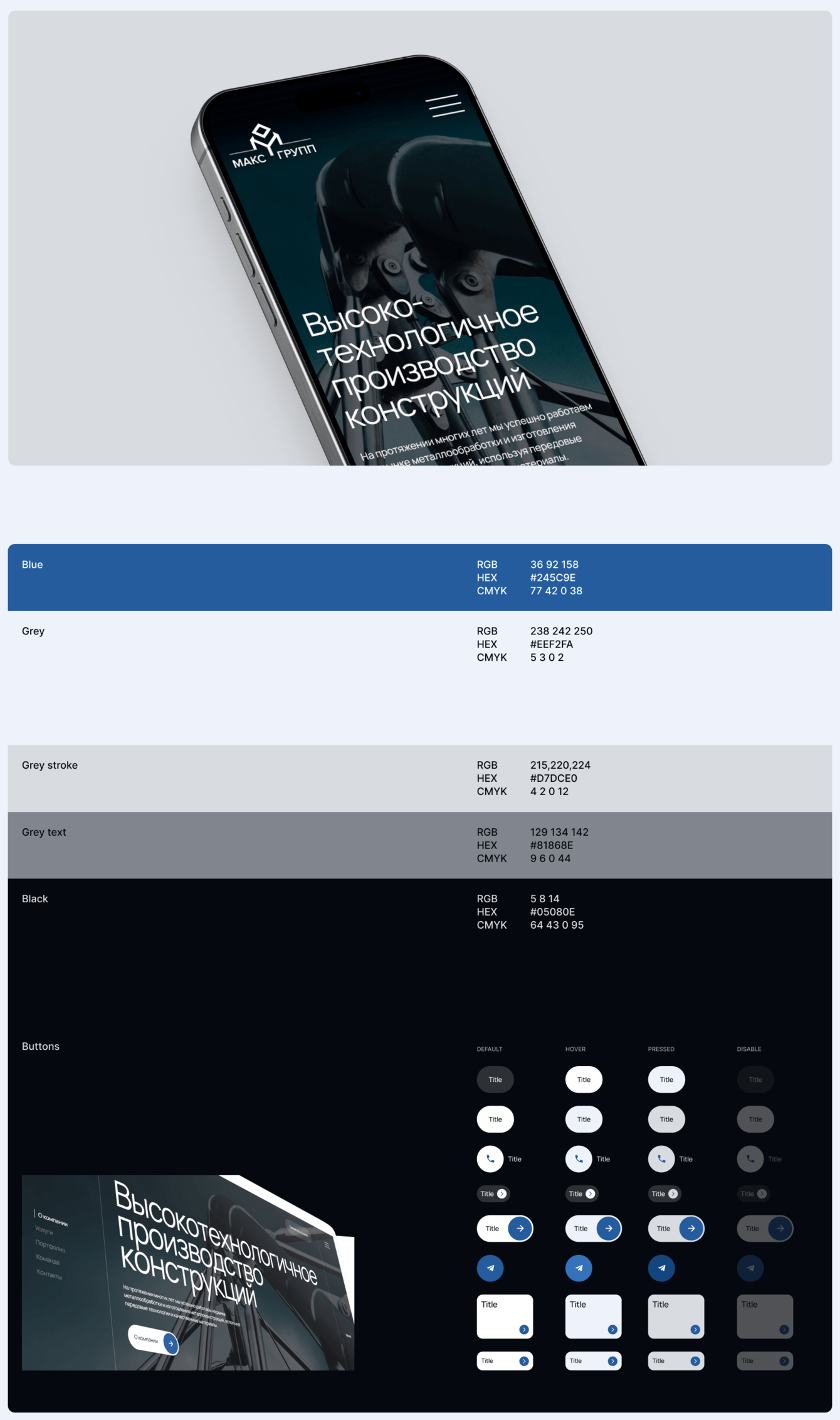 Основная идея дизайна заключалась в том, чтобы обыграть тему промышленности и производства, превращая привычный “серый металл” в нечто современное, легкое и инновационное. Клиент хотел, чтобы, заходя на сайт, пользователь воспринимал контент как на страницах Tesla или Apple — ощущал атмосферу прогрессивности и передовых технологий.