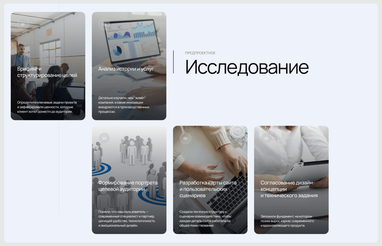 Наша команда, обладающая обширным опытом в реализации проектов для промышленного сектора, с энтузиазмом принялась за дело. Мы решили, что даже индустриальную сферу можно преобразить с помощью креатива и сторителлинга. Весь процесс работы был построен поэтапно, что позволило нам глубоко погрузиться в специфику бизнеса клиента и создать сайт, отражающий его суть и истинный облик.