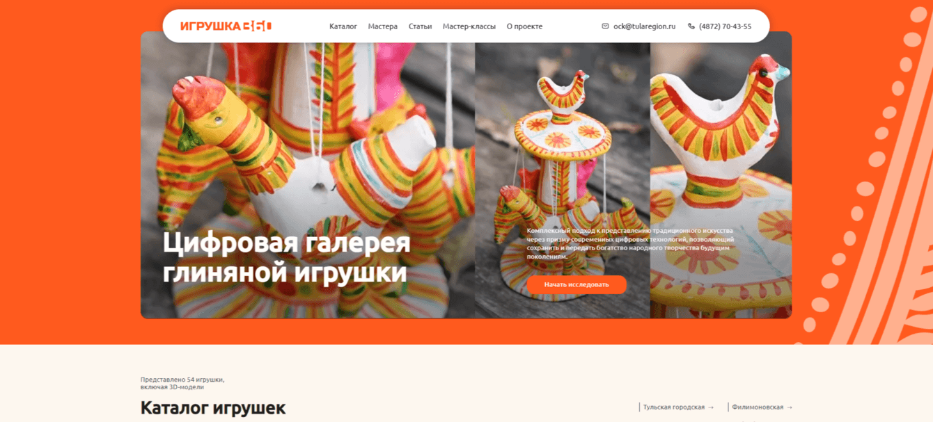 Были изучены архивы, проведена работа с мастерами, сохраняющими секреты этого уникального промысла, дошедшего до нас. На страницах мастеров можно ознакомиться с их биографией и вкладом в развитие традиций культуры. У посетителей сайта есть возможность оформить заказ на изготовление глиняной игрушки.