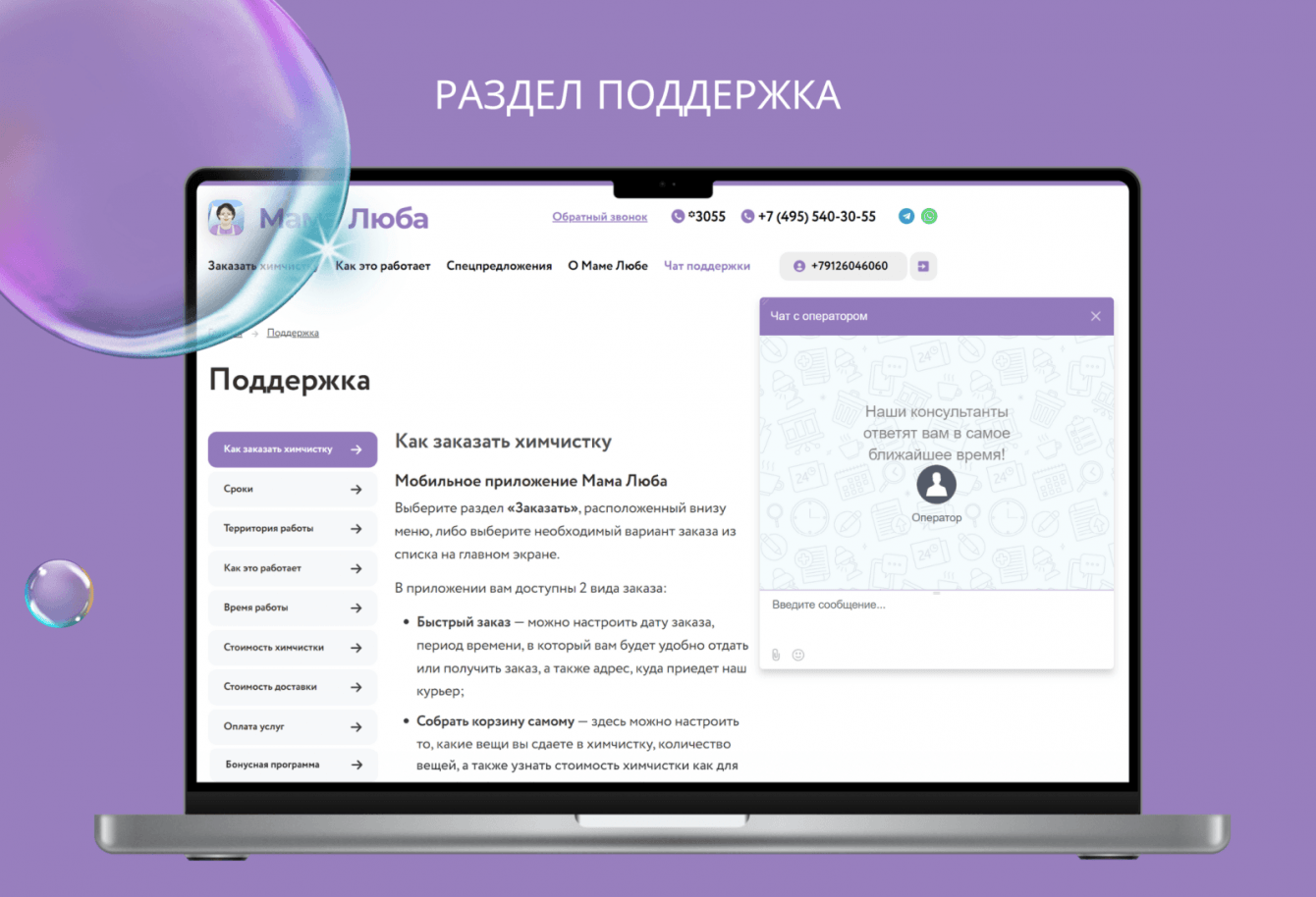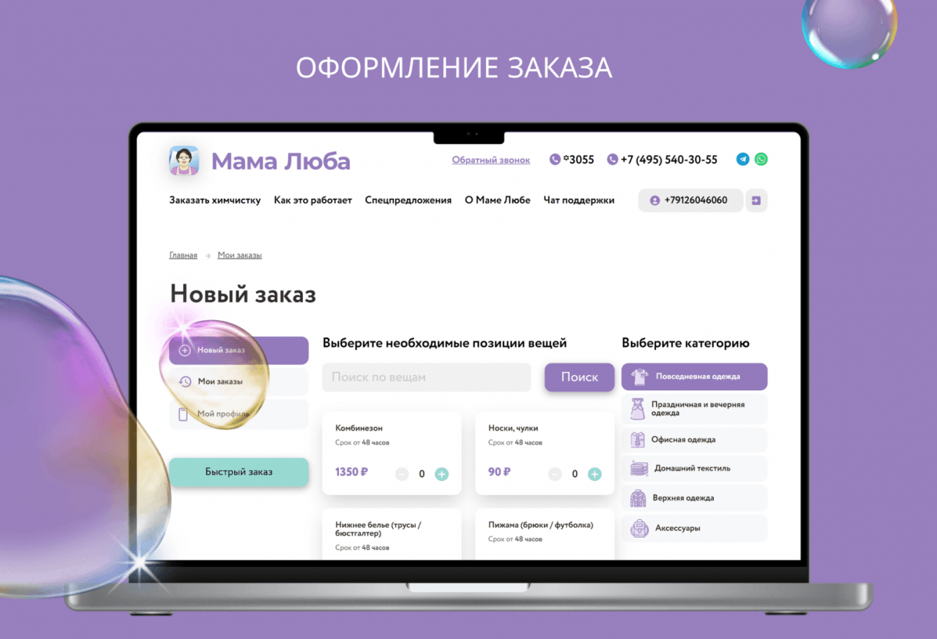 Заказчик получил удобную, стабильно работающую IT-систему, которая дает возможность клиенту без проблем воспользоваться сервисом онлайн-химчистки, а работникам «Мамы Любы» предоставить данную услугу качественно за счет максимальной автоматизации бизнес-процессов: