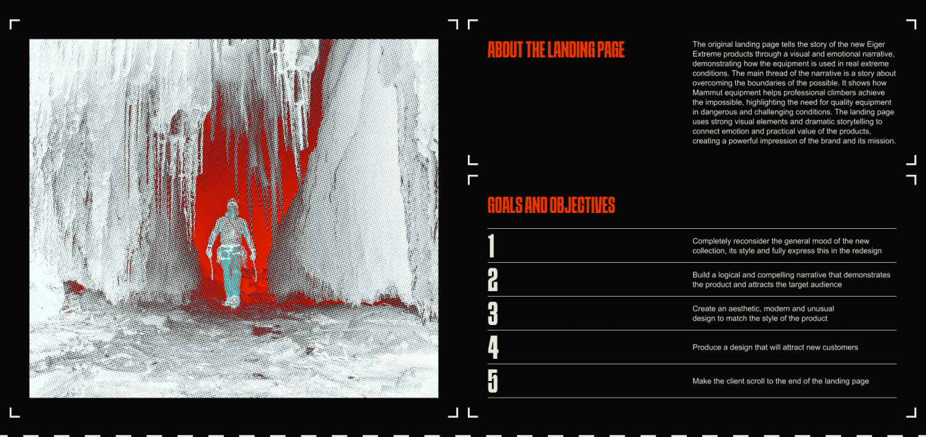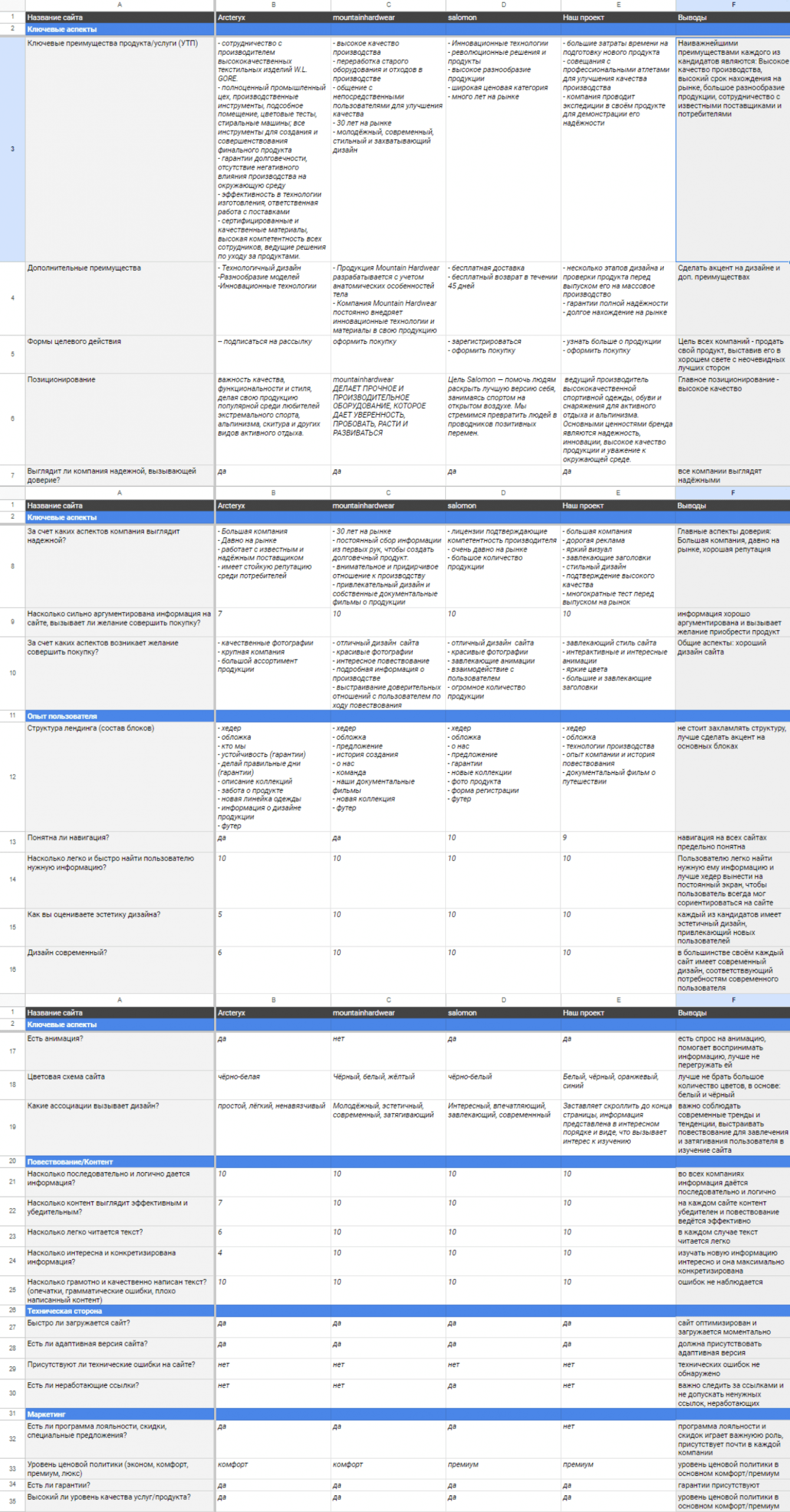 Я собрал список конкурентов в сфере одежды для активного отдыха, спорта, альпинистского снаряжения, провёл конкурентный анализ, в процессе которого сравнил каждого конкурента с компанией заказчика и вывел лучшие решения, которые можно позаимствовать, а также не совсем удачные визуальные решения конкурентов, которые стоит избегать.