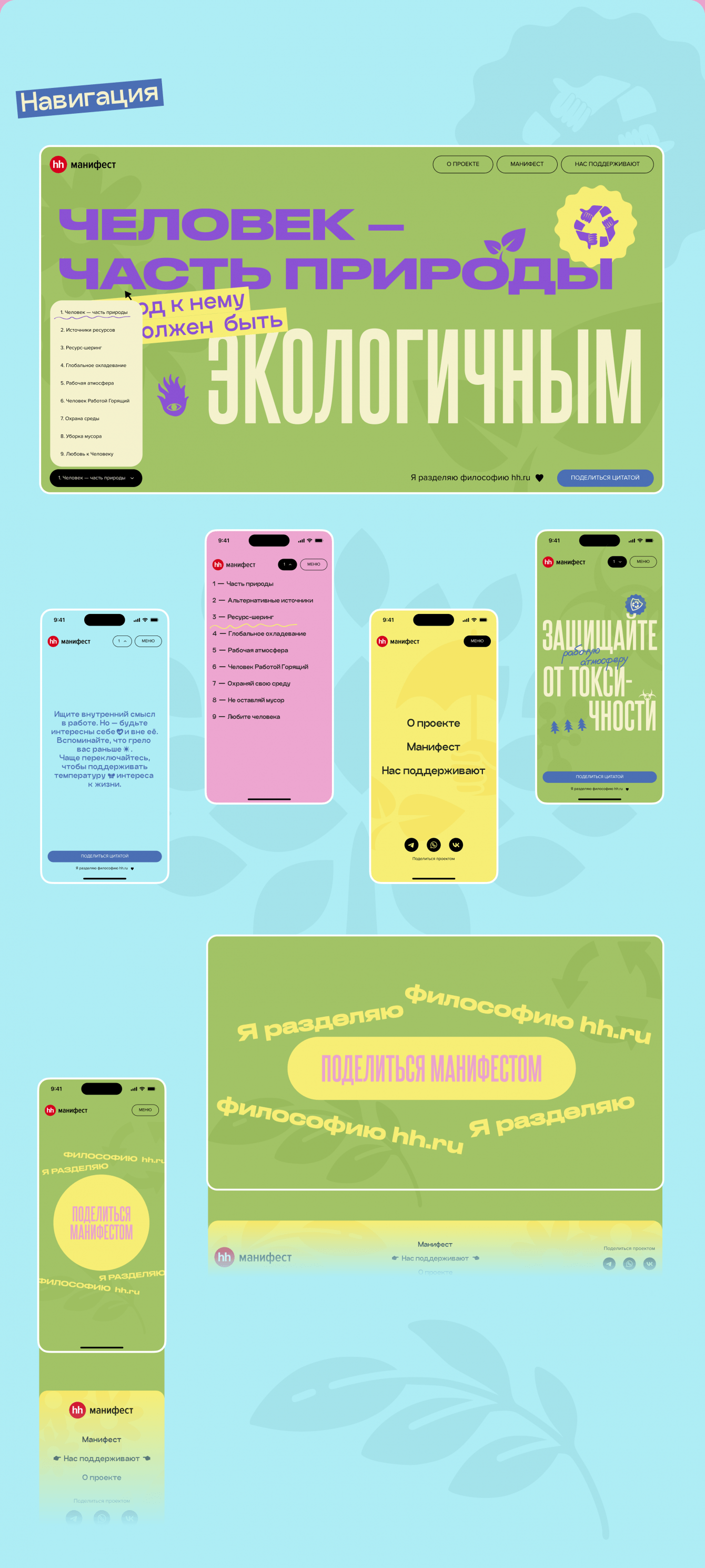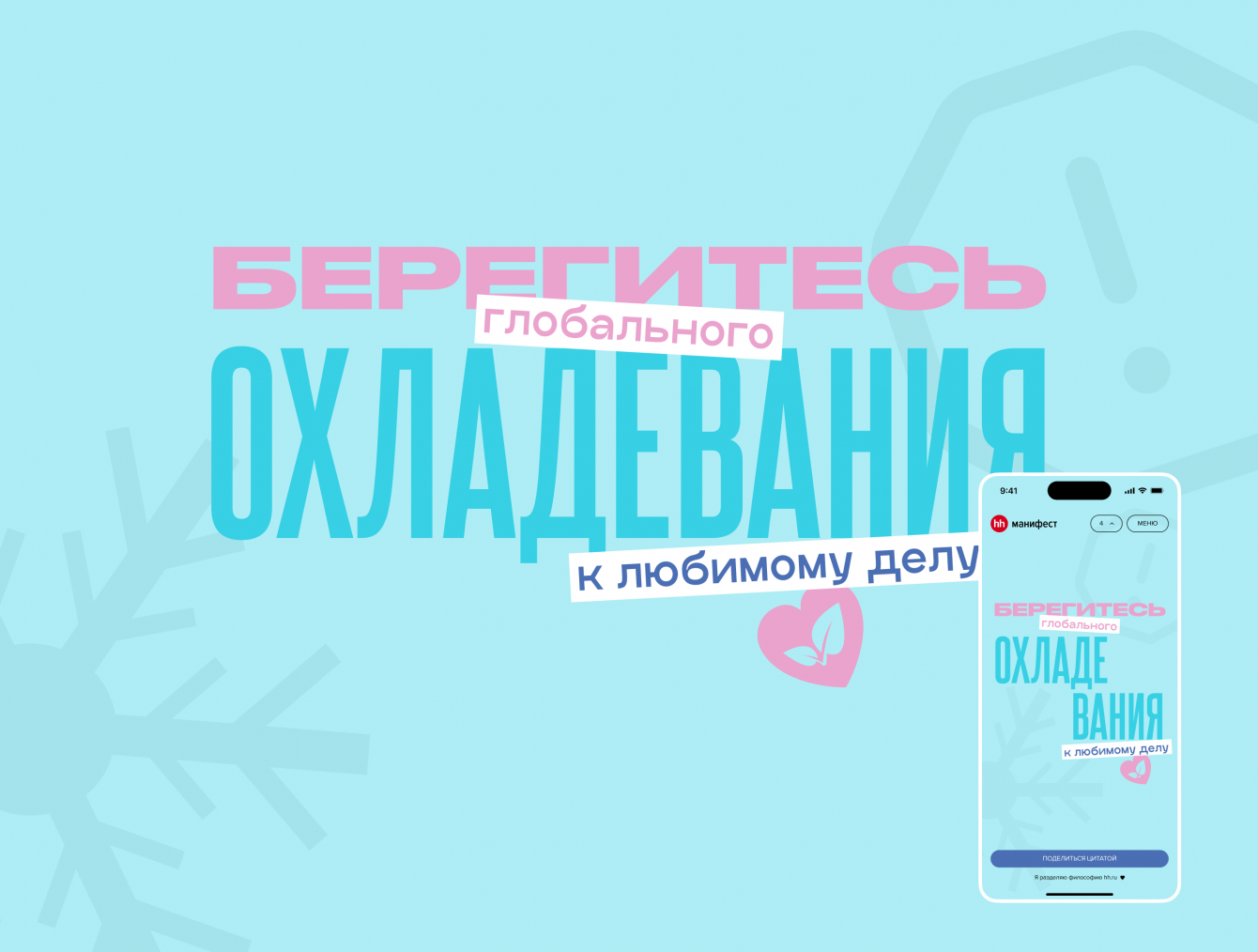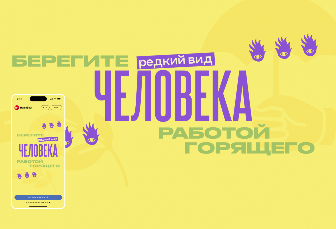 На сайте-манифесте каждый тезис через анимации превращался в открытку и позволял пошерить в соц. сетях или просто сохранить себе как.