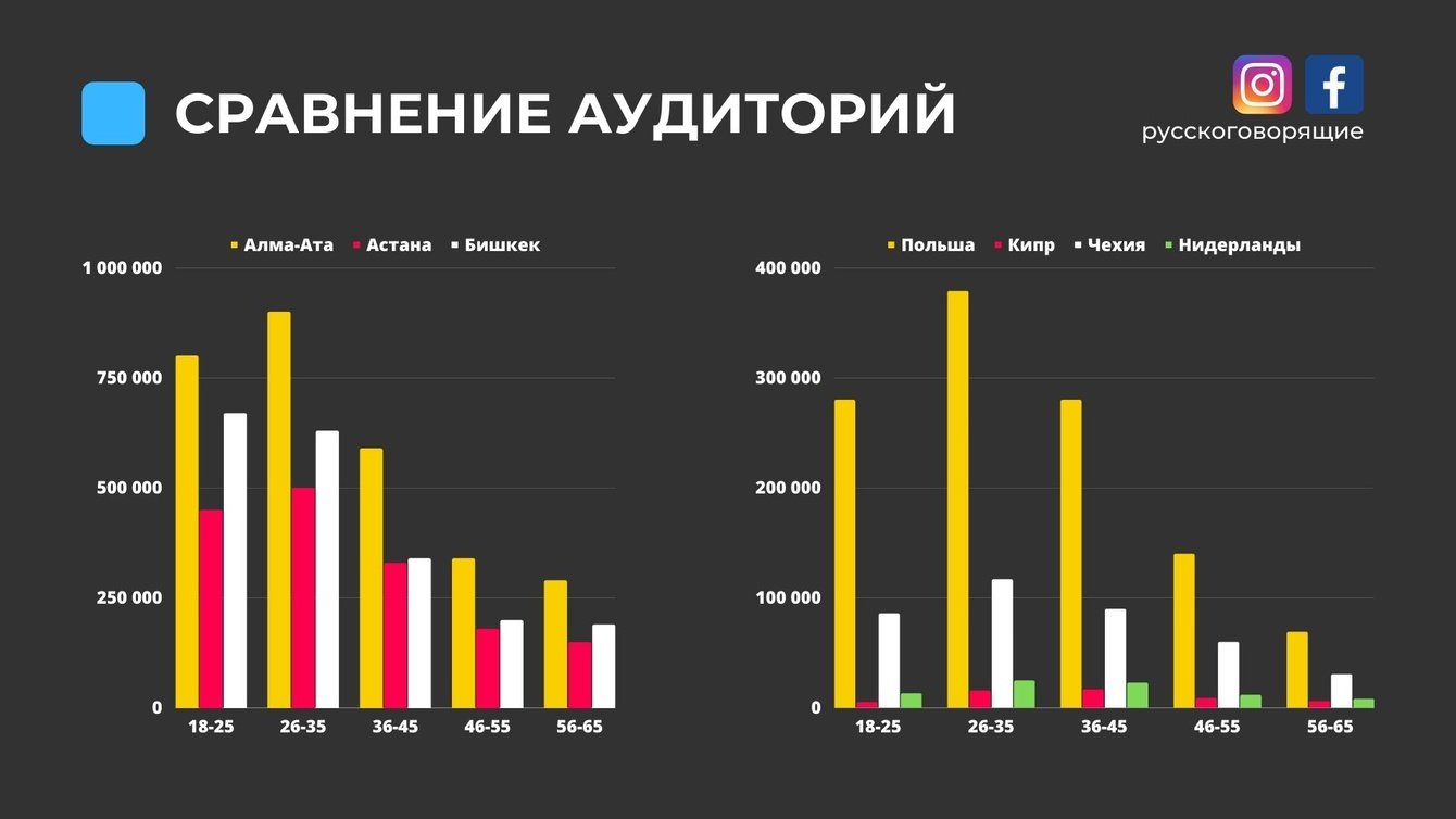 Давайте сравним аудитории по возрасту в самом важном канале для продвижения - Инстаграм и ФБ. Это сравнение позволит нам, опираясь на опыт кейсов, сделать следующие выводы и провести мысленные эксперименты.