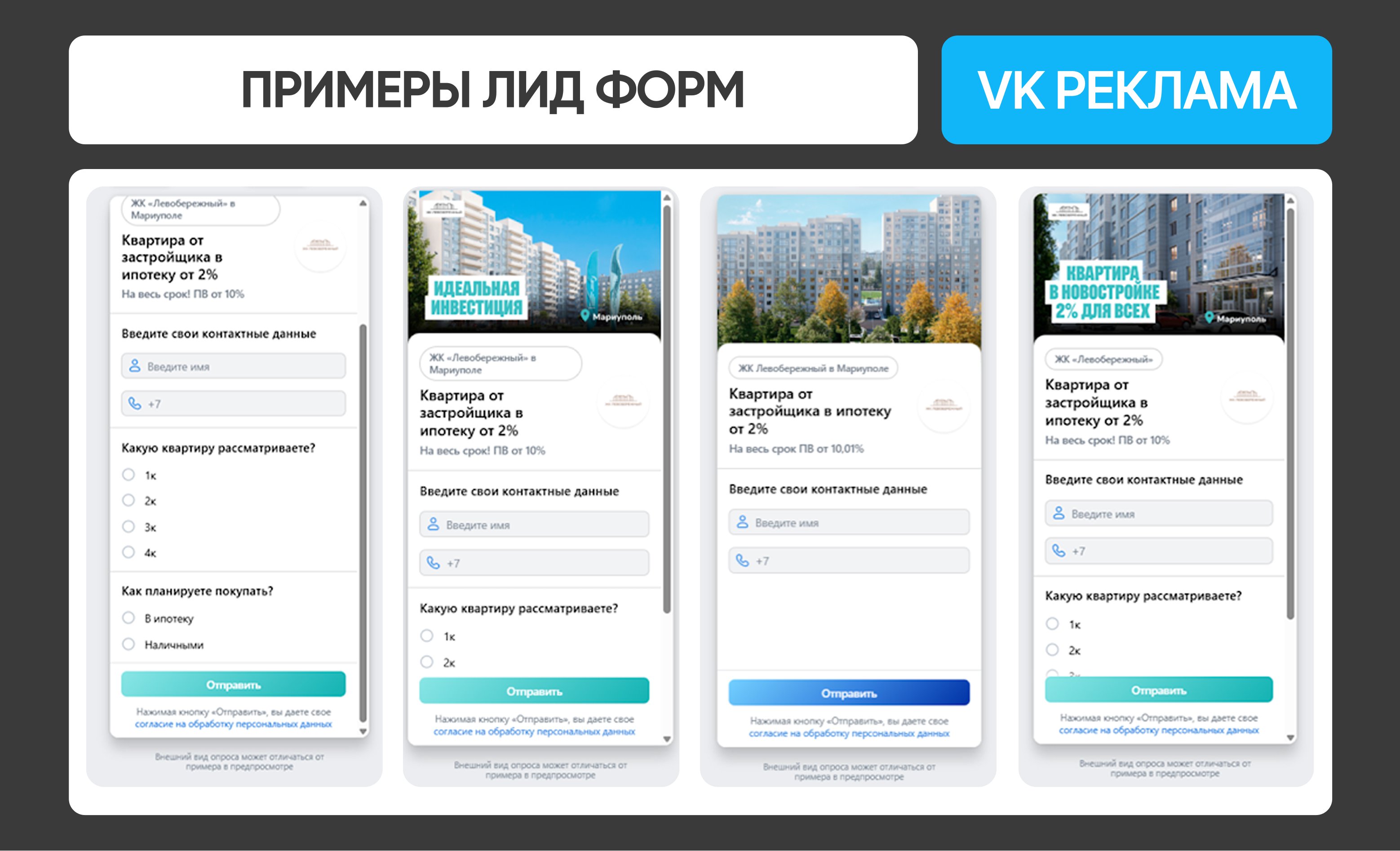 Квиз-опрос (классический, справа) — интерактив с последовательными вопросами. Он вовлекает, сегментирует аудиторию (бюджет, цель покупки, регион, формат) и передает в отдел продаж более квалифицированный лид.