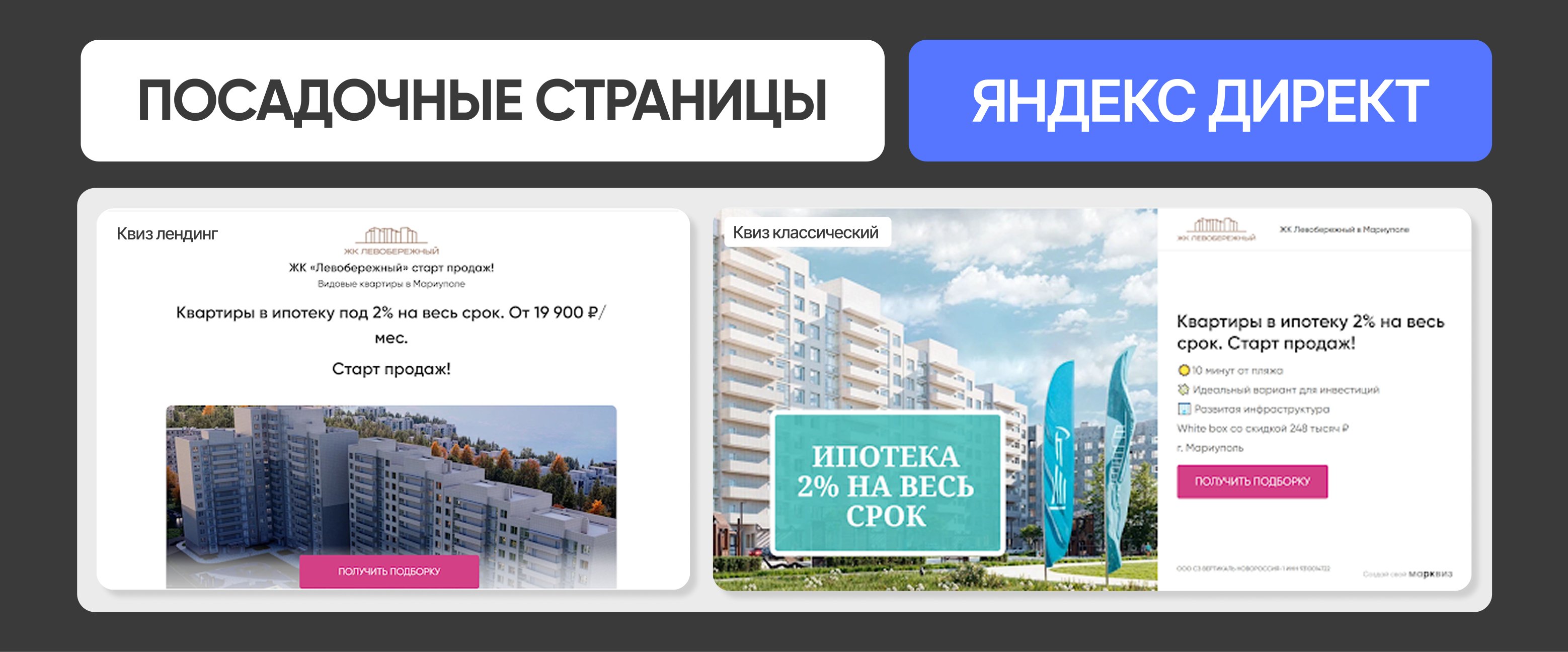 Квиз-лендинг (слева) — гибридный формат: сначала пользователь знакомится с проектом в формате мини-презентации, затем переходит в квиз-опрос для квалификации.