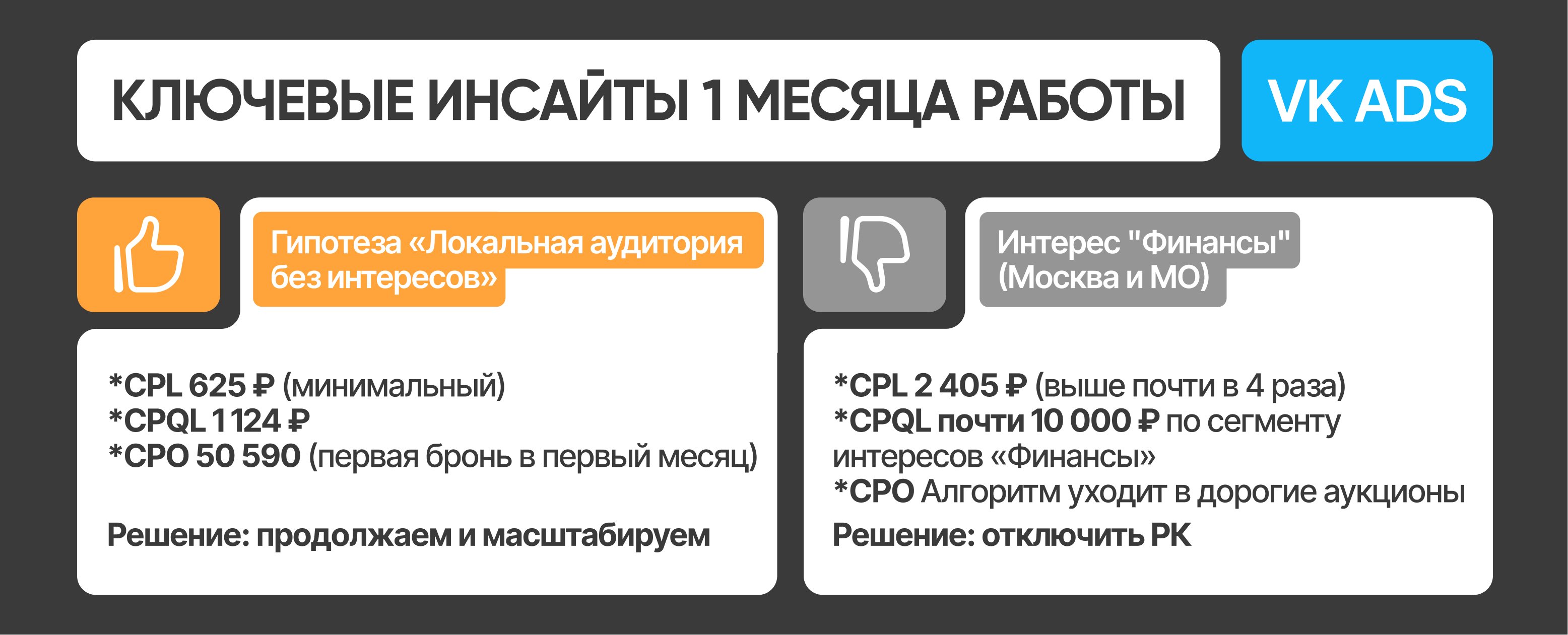 При этом у него оставались сомнения: VK казался дорогим каналом с низкой отдачей, а Яндекс Директ — источником недостаточного объема лидов.