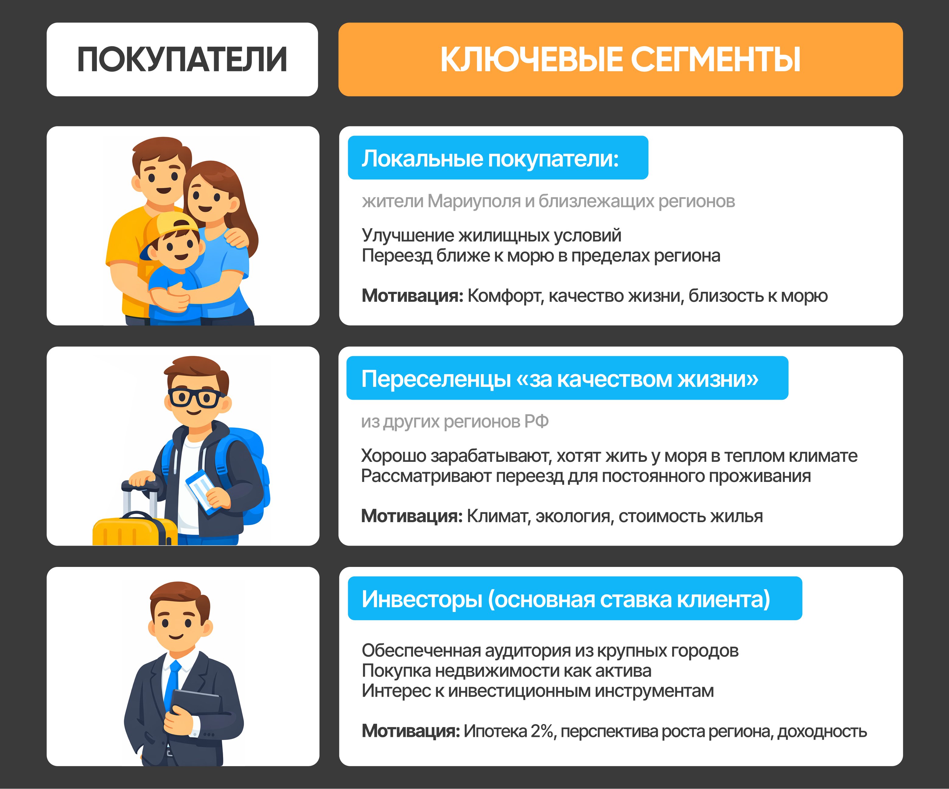 Клиент ставил на инвесторов из Москвы — логично: ипотека 2%, жилье у моря, перспектива роста региона. Логика покупки «на будущее», а не для немедленного проживания. Известен и аналогичный исторический опыт: так раскупили Сочи.
