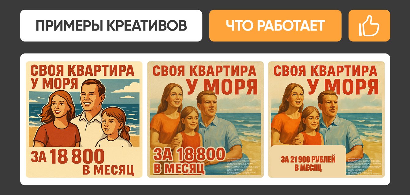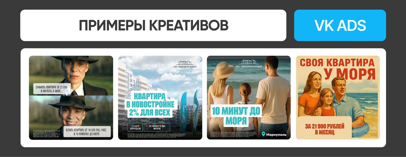 Да, оффер был у всех застройщиков региона, но именно комбинация «ипотека + нестандартный визуал + локальный таргетинг» дала эффект, который повторить обычными креативами в перегретой VK рекламе невозможно.