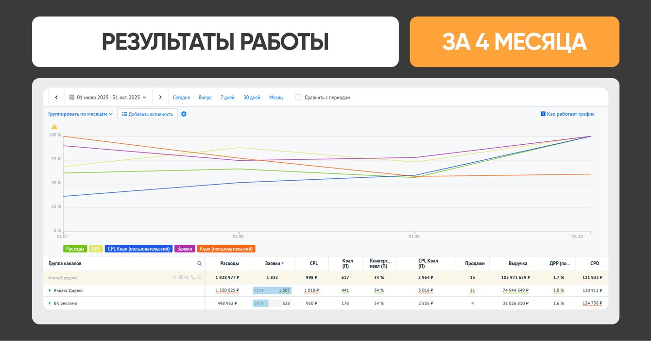 Кейс о первых 4 месяцах работы, но работа продолжается. За эти месяцы мы не просто запустили кампании, а выстроили рабочую модель лидогенерации, протестировали гипотезы, оптимизировали креативы и диверсифицировали каналы.