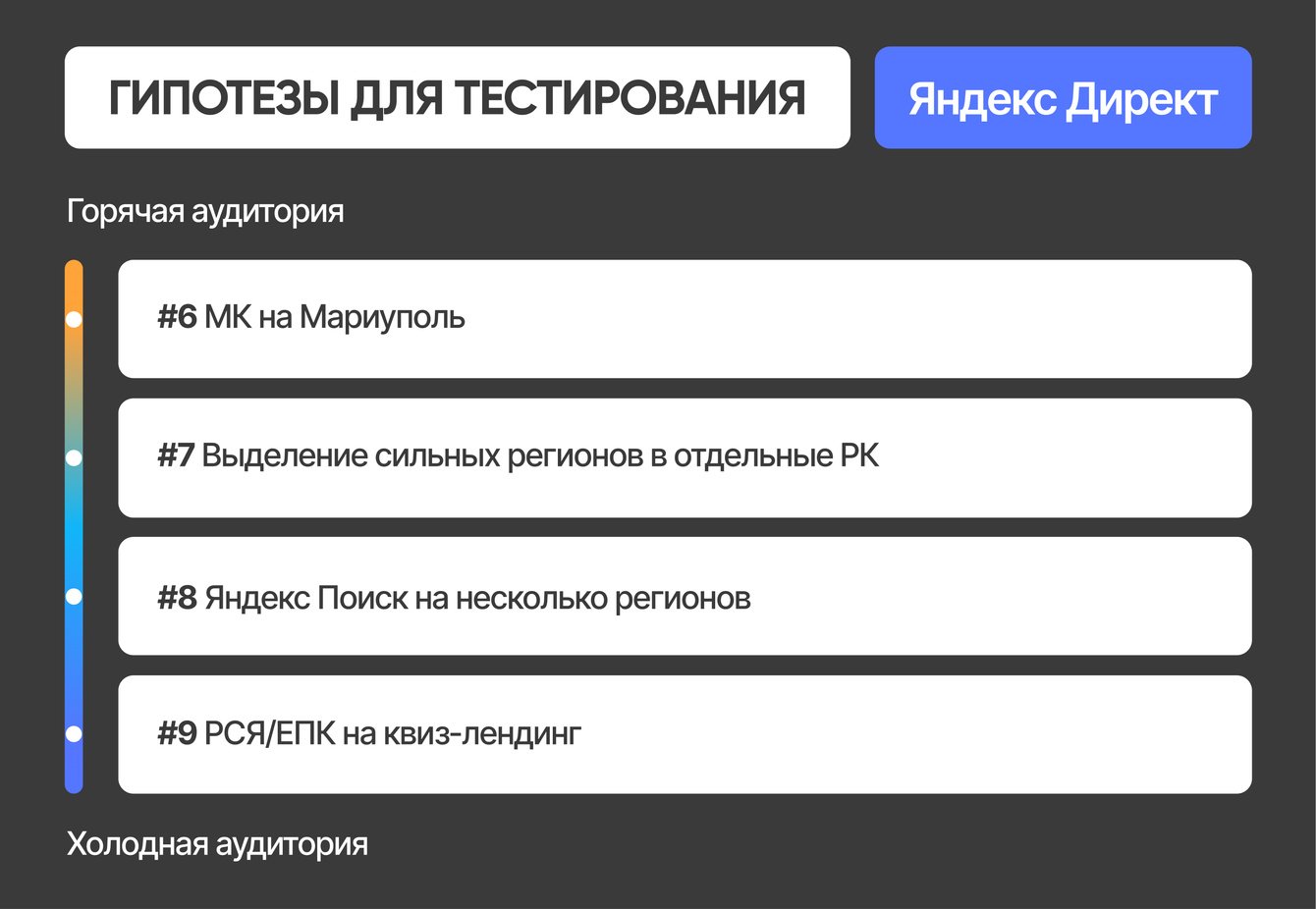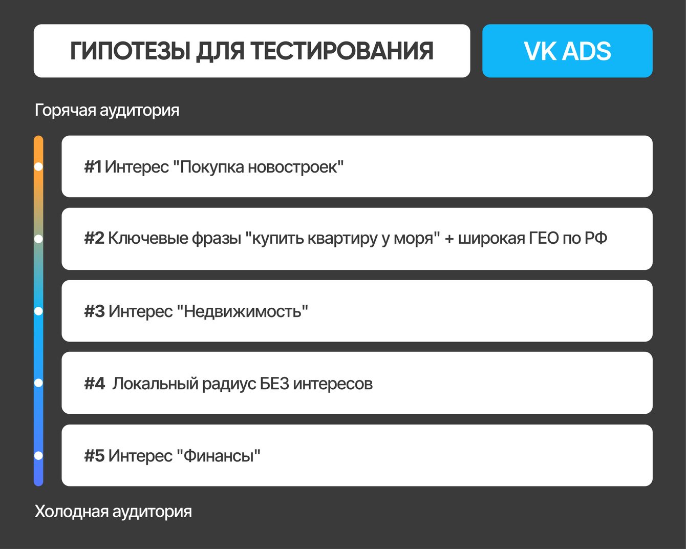 Несмотря на уверенность клиента в том, что основной спрос будет со стороны инвесторов из Москвы и Московской области, мы приняли решение запустить все ключевые гипотезы одновременно:
