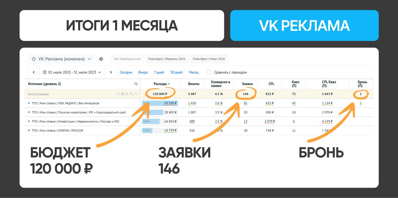 Система продолжает приносить стабильные лиды, показы, брони и продажи спустя 7 месяцев с управляемой стоимостью сделки и понятной логикой масштабирования.