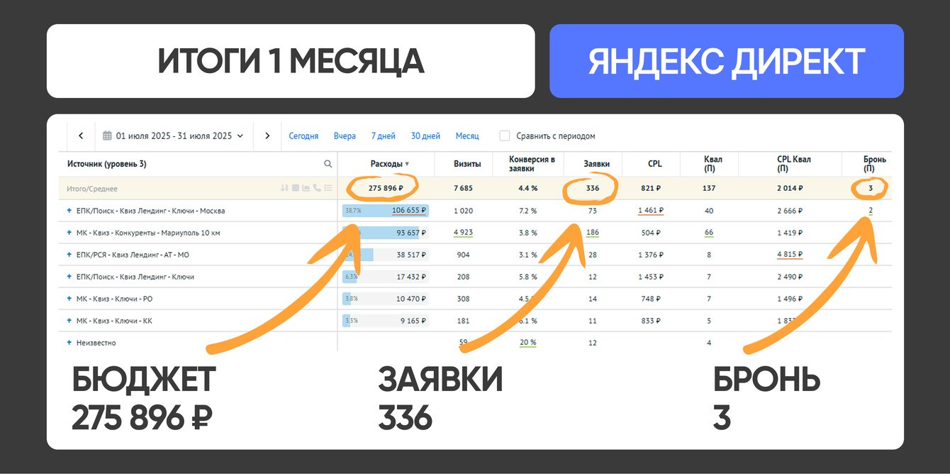 За первый месяц получили 336 заявок и 3 забронированных квартиры с трафика Яндекс Директ, регистрация ДДУ по ним прошла в августе!
