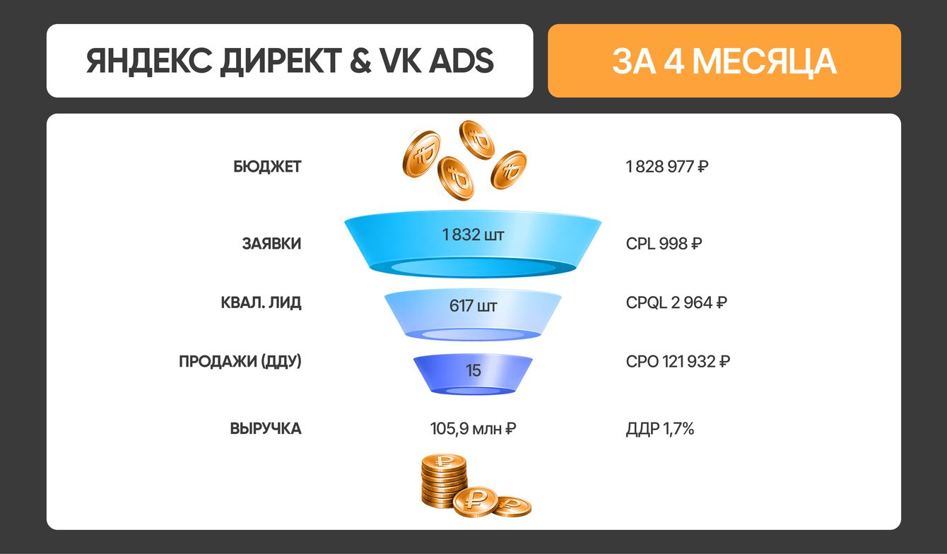 Комбинация Яндекс Директ и VK рекламы дала 1 832 заявки, 15 продаж на 105 млн ₽ и ДРР 1,7%. При сбое одного канала второй подстраховал, а аудитории с разными намерениями усиливали и давали синергетический эффект.