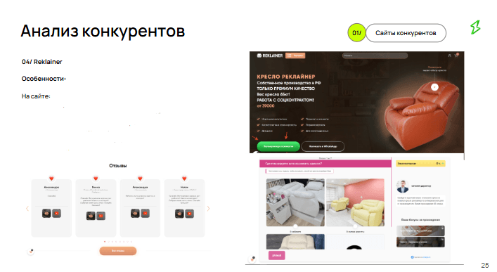 Мебельное бюро "Перевалов" занимается производством кресел и диванов-реклайнеров для дома и офиса. Компания работает на рынке более 5 лет и активно развивает продажи через собственный сайт и маркетплейсы. Основной запрос клиента – увеличение продаж и повышение узнаваемости бренда. Мы разработали маркетинговую стратегию, которая не только поможет достичь этих целей, но и обеспечит долгосрочный план действий.