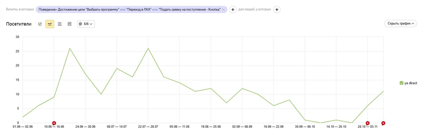 Конверсия на сайте была очень низкой. В процессе ведения мы настроили событие на кнопку перехода в ЛК абитуриента, что должно было привести к улучшению показателей и увеличению количества переходов в ЛК.