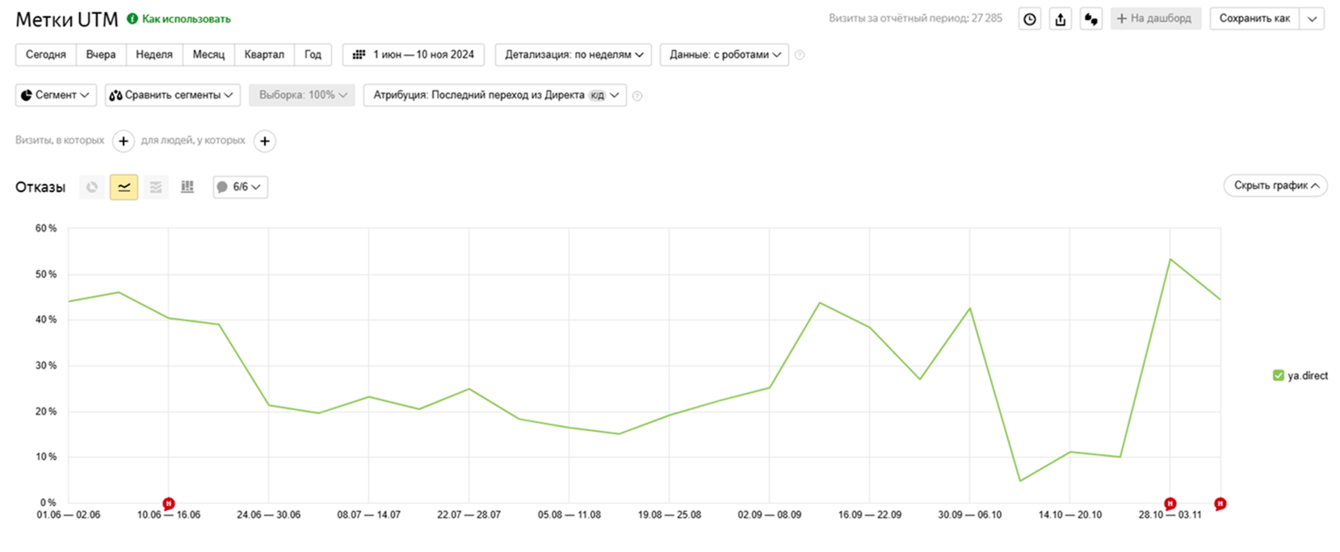 Первые две недели была оптимизация, в в течение которой мы работали с высокими отказами. Они достигали 46%. Проводили минусацию. Было решено отключить показы на мобильных устройствах в РСЯ, так как отказы в основном шли с них.