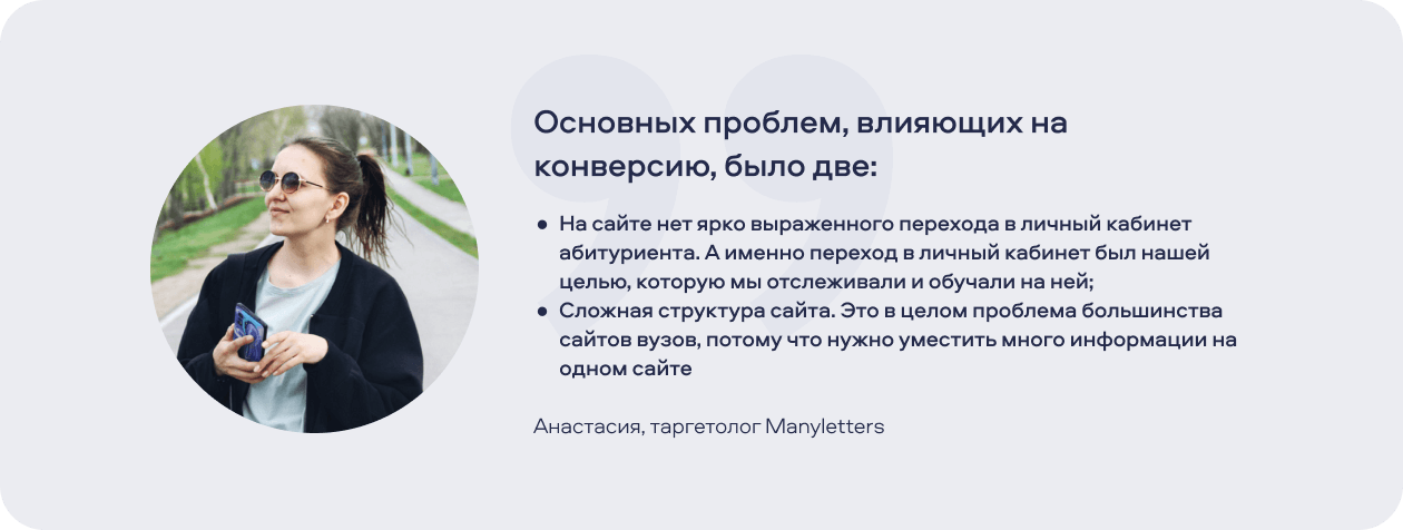 Первую проблему мы уже озвучили в анонсе — это невозможность доработать сайт вуза. Мы составляли план рекомендаций, которые помогут увеличить конверсию и снизить цену за лид, но с таким крупным заказчиком это не так просто. У вуза есть свои требования к оформлению и единообразию всего сайта, поэтому мы запускали и оптимизировали, не ожидая доработок.