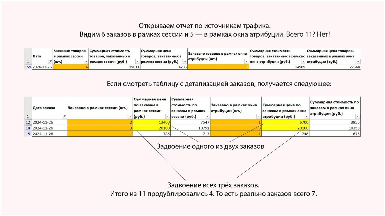 Четыре заказа из окна сессии продублировались в окно атрибуции. Итого за день получается не 11 заказов, как если бы мы просто просуммировали ячейки, а всего 7. И так если бы мы подобным образом просто просуммировали два столбца по всем отчетам, то получили бы 90 заказов, хотя по факту их всего 66. Погрешность 36%.