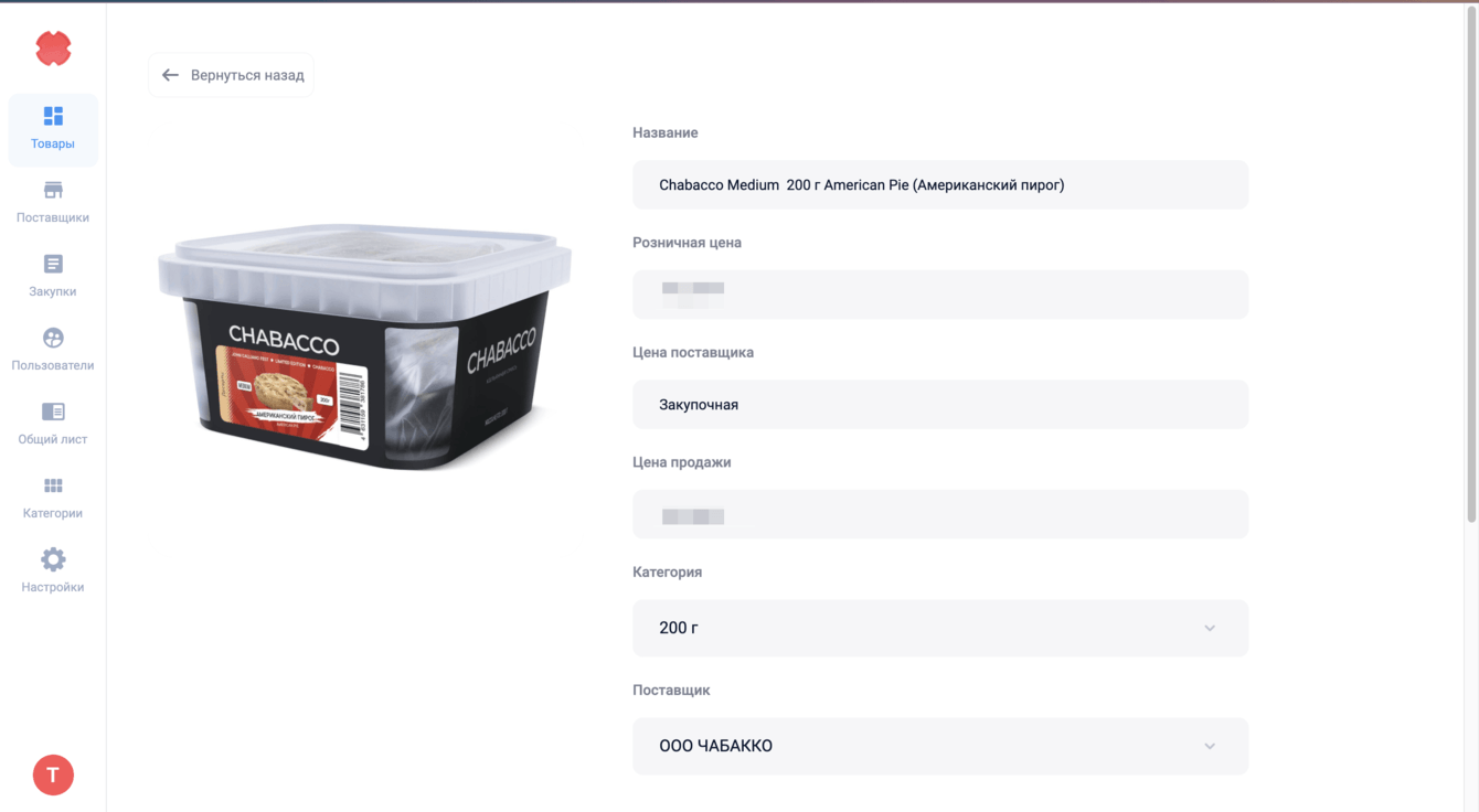 Вкладки: Товары, Поставщики, Закупки, Пользователи, Общий лист, Категории, Настройки