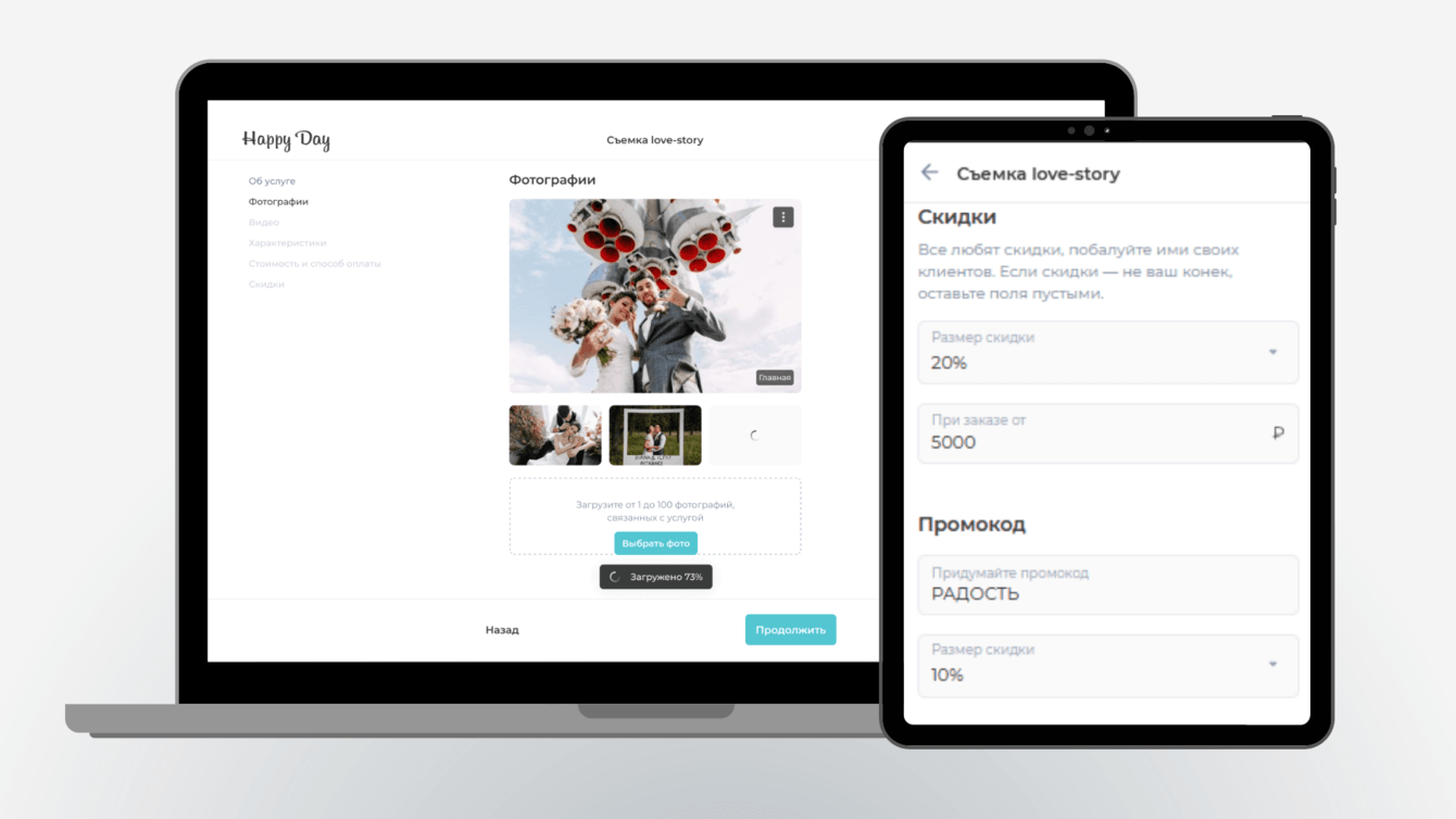 Исполнитель управляет услугами и товарами из личного кабинета, для удобства управления бизнес процессами были внедрены инструменты crm-системы. Добавлена возможность выстраивать собственную систему скидок и промокодов. При создании услуги можно добавить фото, видеоматериалы и подробное описание. Таким образом, многофункциональный интерфейс помогает исполнителям подробно описать услугу или товар, минимизировать количество ошибок при заполнении карточки товара, что значительно повышает интерес и лояльность клиентов к их продукту.
