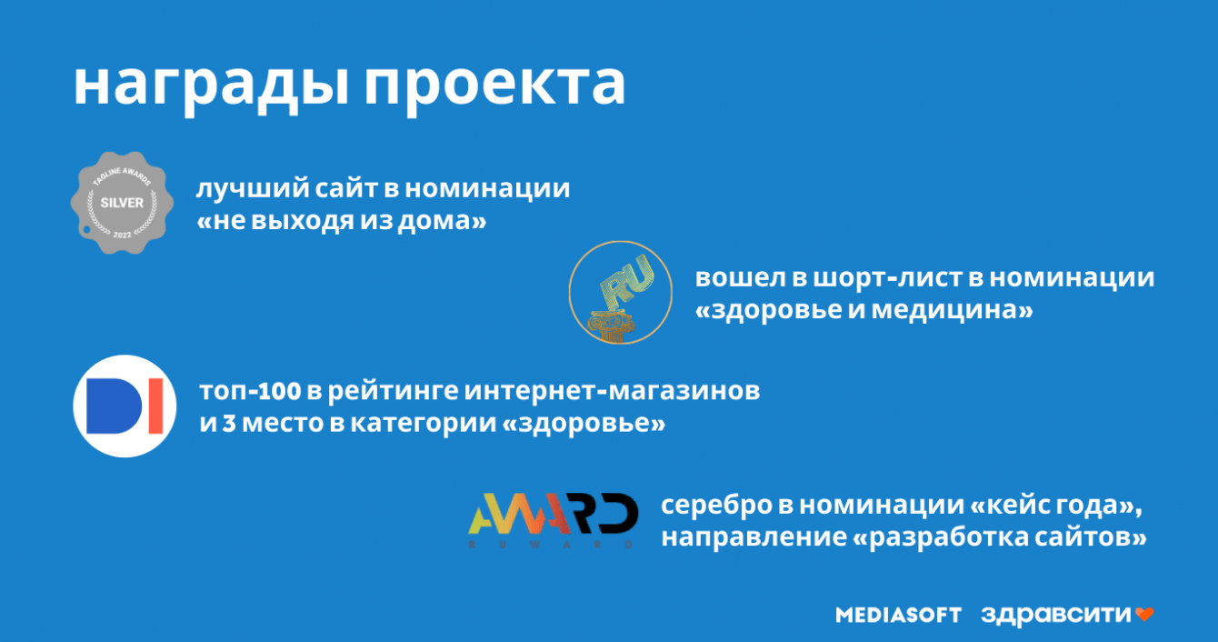 Вошел в топ-100 рейтинга интернет-магазинов по версии Data Insight по итогам 2021 г.: 46 место в общем рейтинге и 3 место в категории «Здоровье».