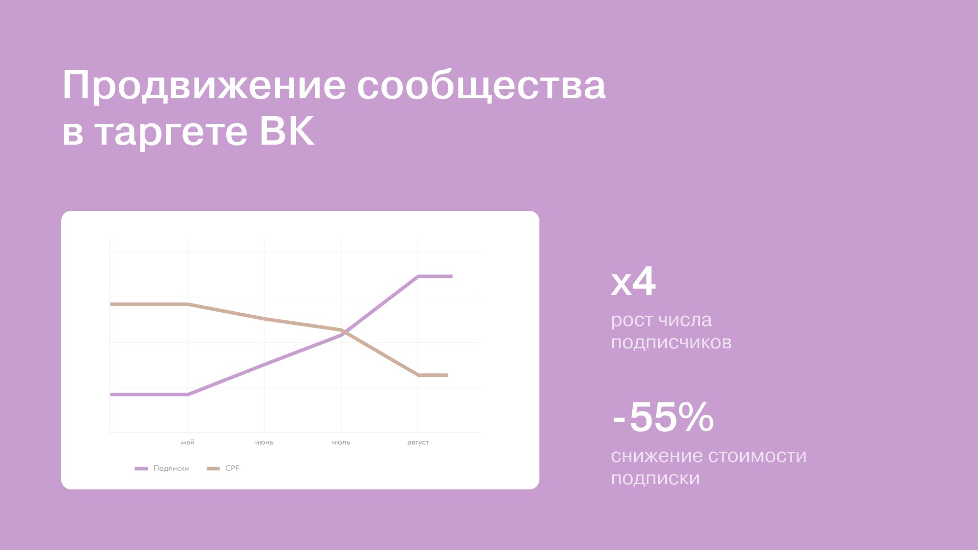 Вместе с заказчиком тестировали множество креативов и планомерно снижали стоимость подписки. Увеличили число подписок и подняли охваты публикаций сообщества среди его собственных подписчиков.