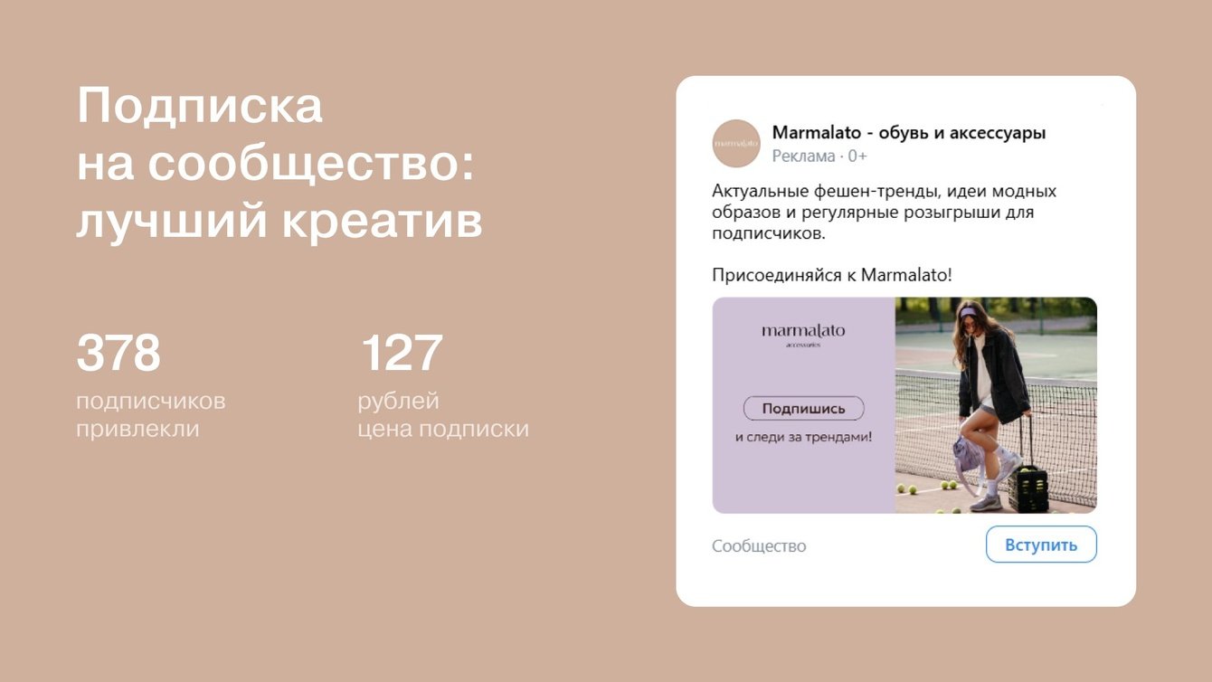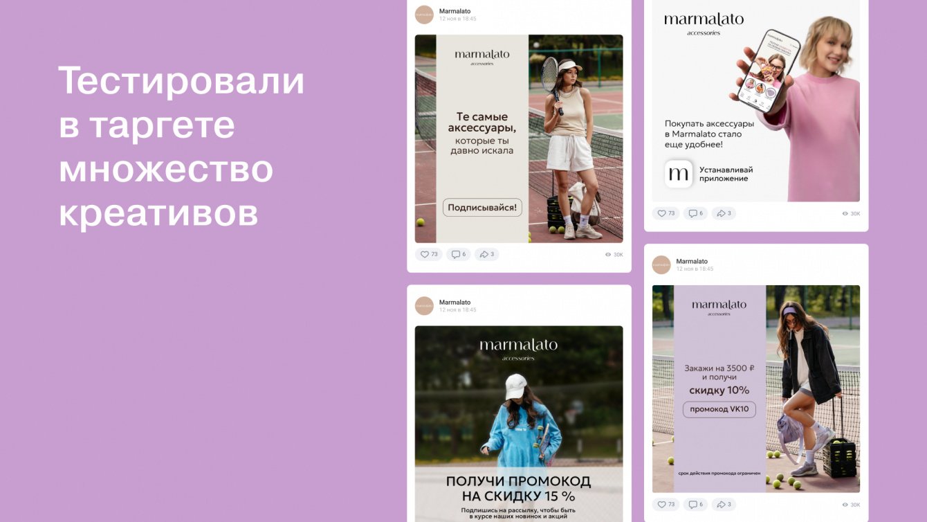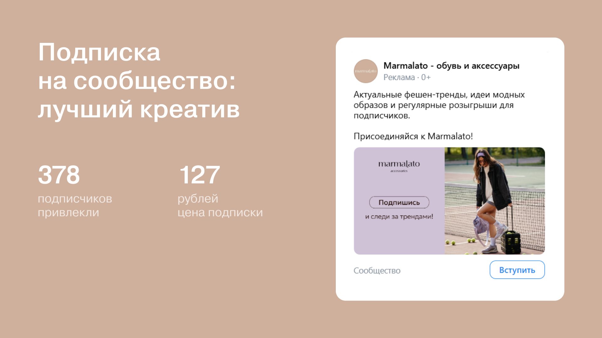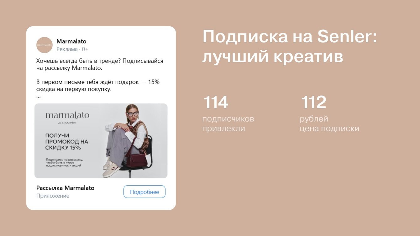 Мы продвигаем подписку на Senler — сервис рассылок внутри ВКонтакте. Пользователи подписываются на Senler и получают промокоды, а также информацию об акциях и новых товарах Marmalato.