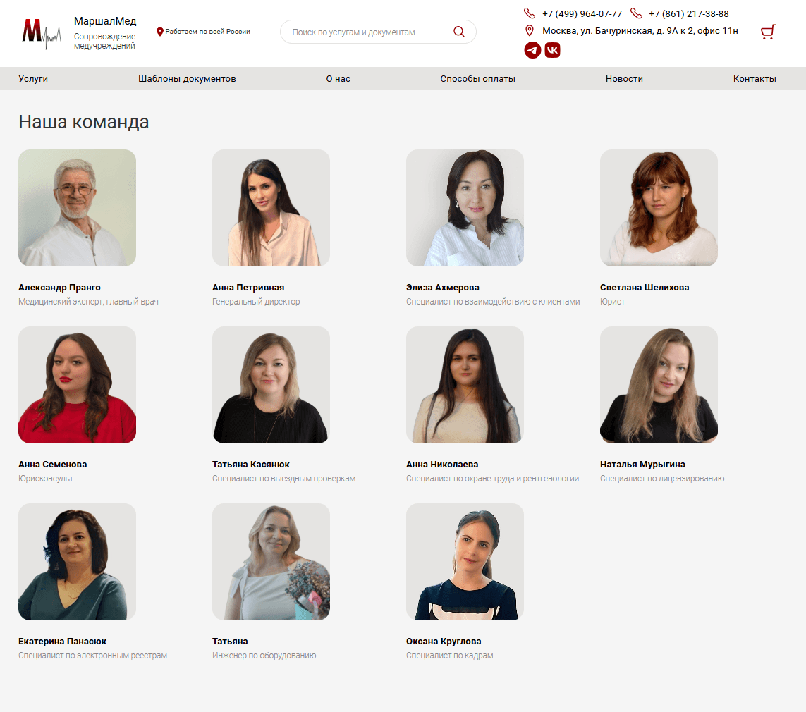 Сайт компании, которая оказывает юридические услуги для медицинских учреждений. Имеет в своем штате не только юристов, но и инженеров, специалистов по бухгалтерскому учету, кадрам, регистрации и ведению всех необходимых медицинских реестров, маркетологов. Кроме того, компания реализует шаблоны документов по медицинской тематике. На сайте представлен весь каталог документов, любой из которых можно добавить в корзину, приобрести, оплатить онлайн.